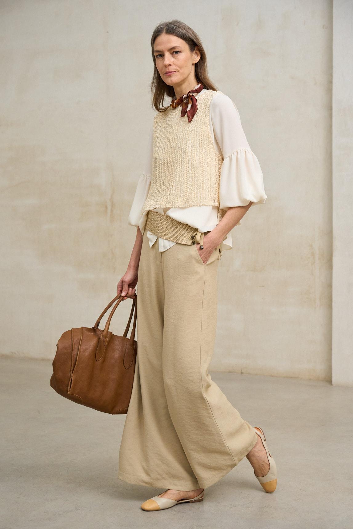 The Mireya off-white blouse is a light and delicate garment, crafted from a semi-sheer fabric that adds movement and subtlety to the design. Its fluid silhouette and soft drape create an elegant and feminine effect, ideal for bright and sophisticated outfits. It features a rounded neckline and slightly puffed long sleeves with elastic cuffs, balancing volume and lightness. The translucent finish of the fabric adds visual depth and allows for layering; we recommend combining it with a T-shirt or top underneath for added coverage. The off-white tone enhances its versatility and makes it an essential piece in a neutral wardrobe. Perfect for pairing with flowy trousers, midi skirts, or light denim, for both casual and more sophisticated looks. We strive to display colors as accurately as possible, but they may vary slightly from reality.
