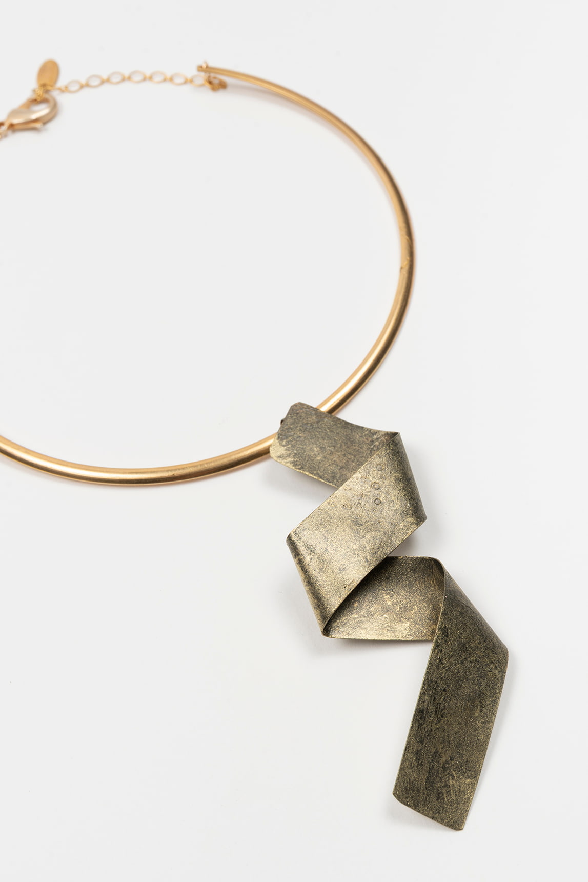 This sculpturally inspired statement necklace makes a stylish statement that adds character and presence. The antiqued brass spiral hangs like a moving piece of art, capturing the eye with its organic shape and matte texture. Its structured design and gold finish make it a striking yet balanced accessory, ideal for elevating any look with an artistic and sophisticated touch. Perfect for those seeking jewelry with personality, visual strength, and a contemporary soul.