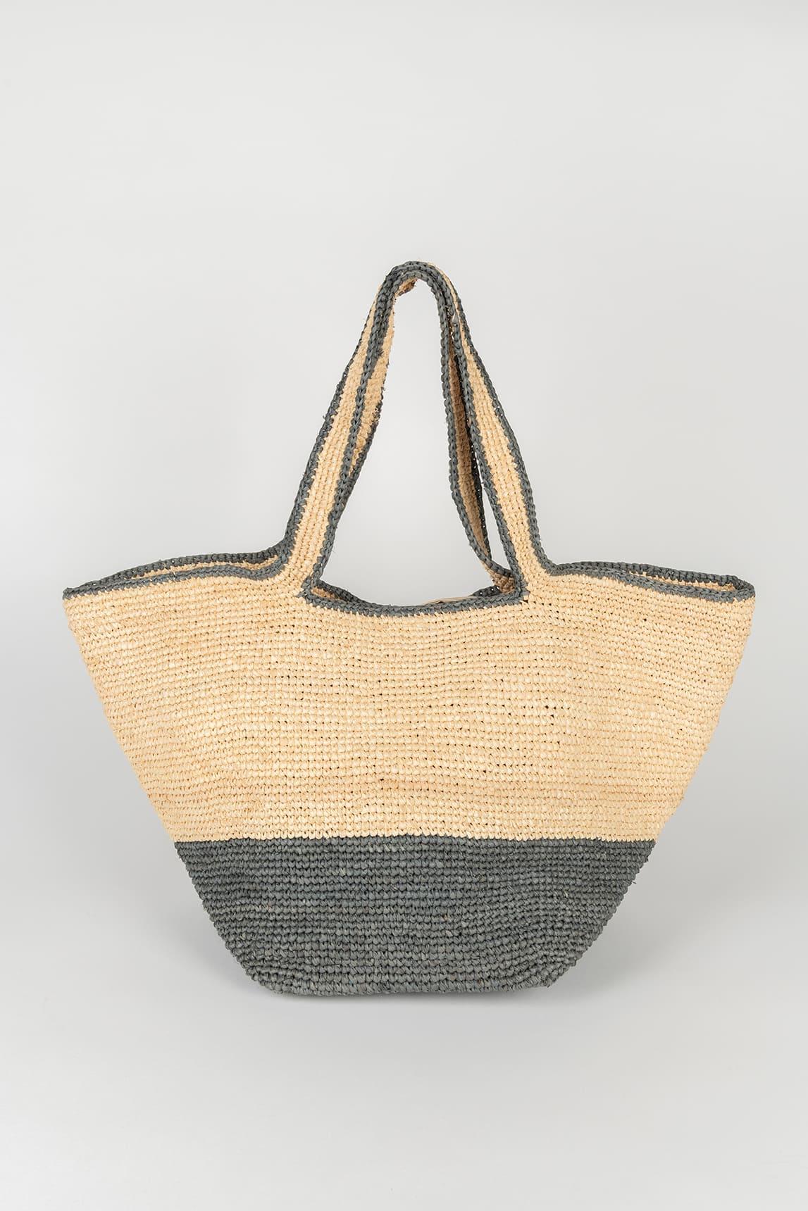 Bolso de mujer en rafia bicolor con combinación de natural y savia, diseñado en formato amplio con base redondeada y asas cortas integradas. La estructura presenta un trenzado visible de inspiración artesanal y una silueta generosa que aporta capacidad, ligereza visual y un acabado muy veraniego. El contraste en savia introduce un matiz natural y sofisticado que enriquece el conjunto.