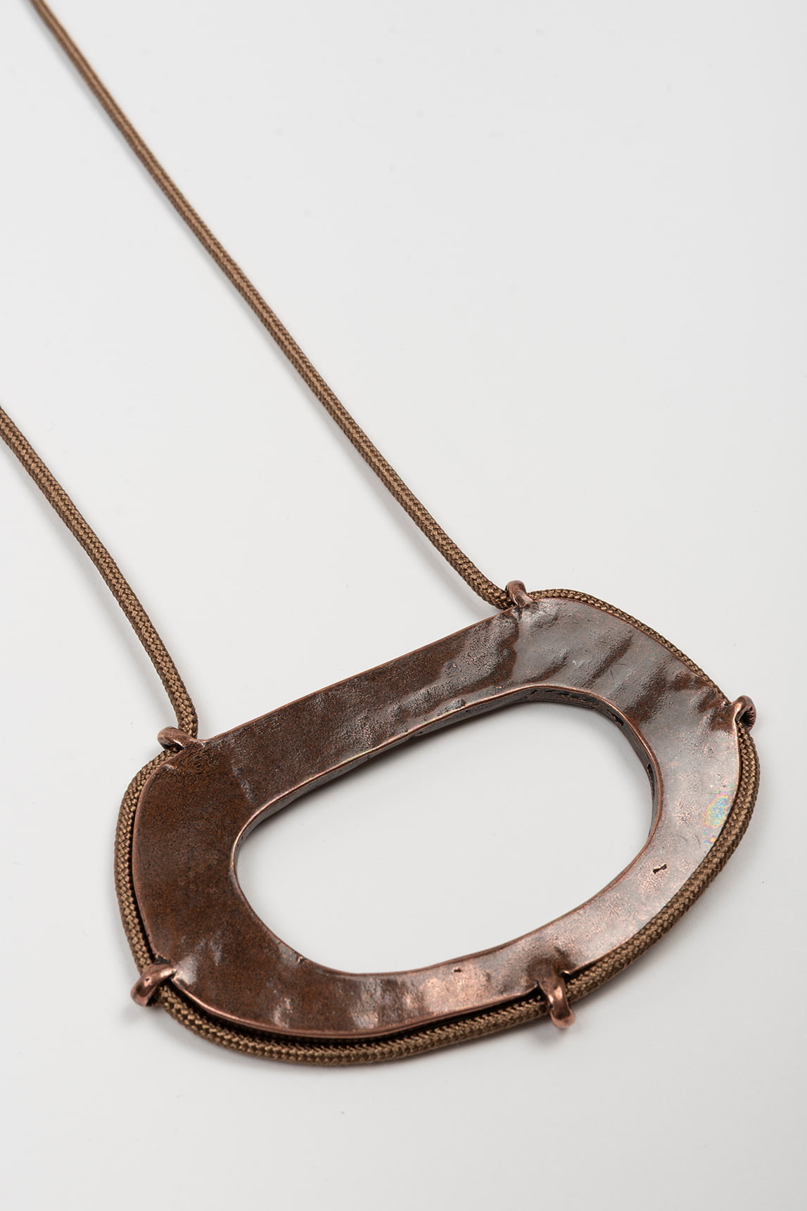 Long necklace with an organic, openwork oval metal centerpiece plated in antique brass, providing a rustic yet contemporary touch. Its sturdy yet visually lightweight structure makes it an accessory with character and balance.