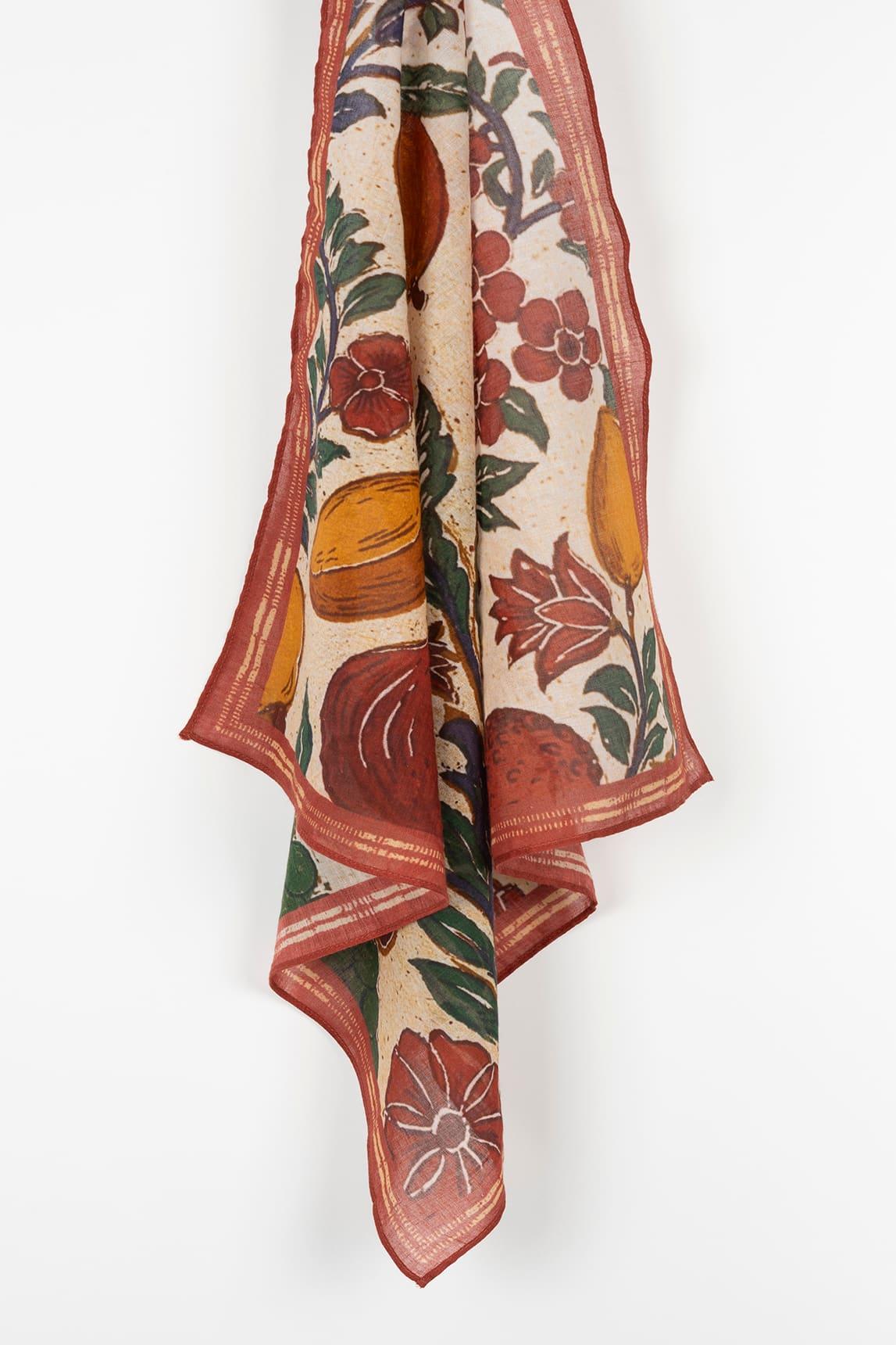 El diseño se enmarca con un borde en terracota que realza el conjunto y le da un acabado definido y elegante. Confeccionado en tejido ligero y de caída fluida, se adapta con naturalidad al movimiento y permite llevarlo suelto, anudado al cuello o sobre los hombros como chal ligero.