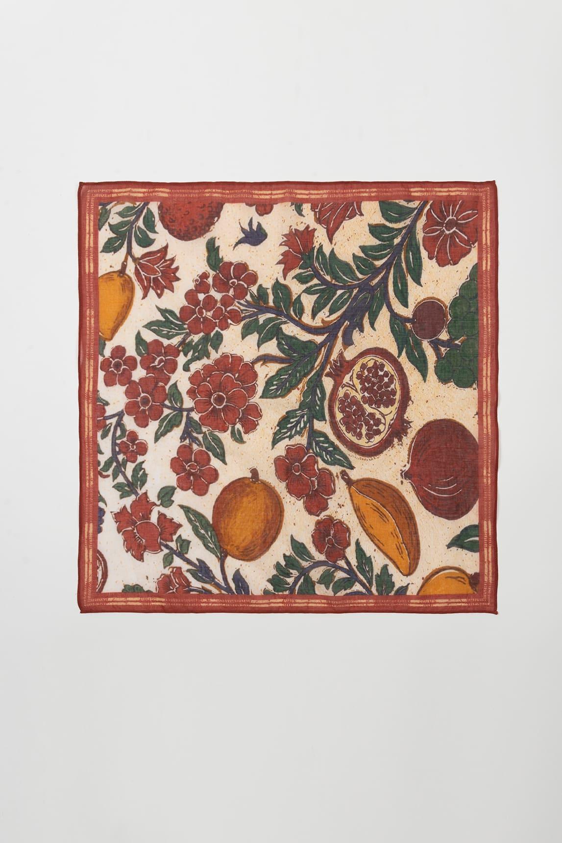 El pañuelo Rosven Terracota destaca por su estampado floral de inspiración clásica reinterpretado en clave contemporánea. Sobre una base clara se despliegan flores en tonos terracota, rojo teja y matices mostaza, acompañadas de hojas verdes que aportan contraste y profundidad.