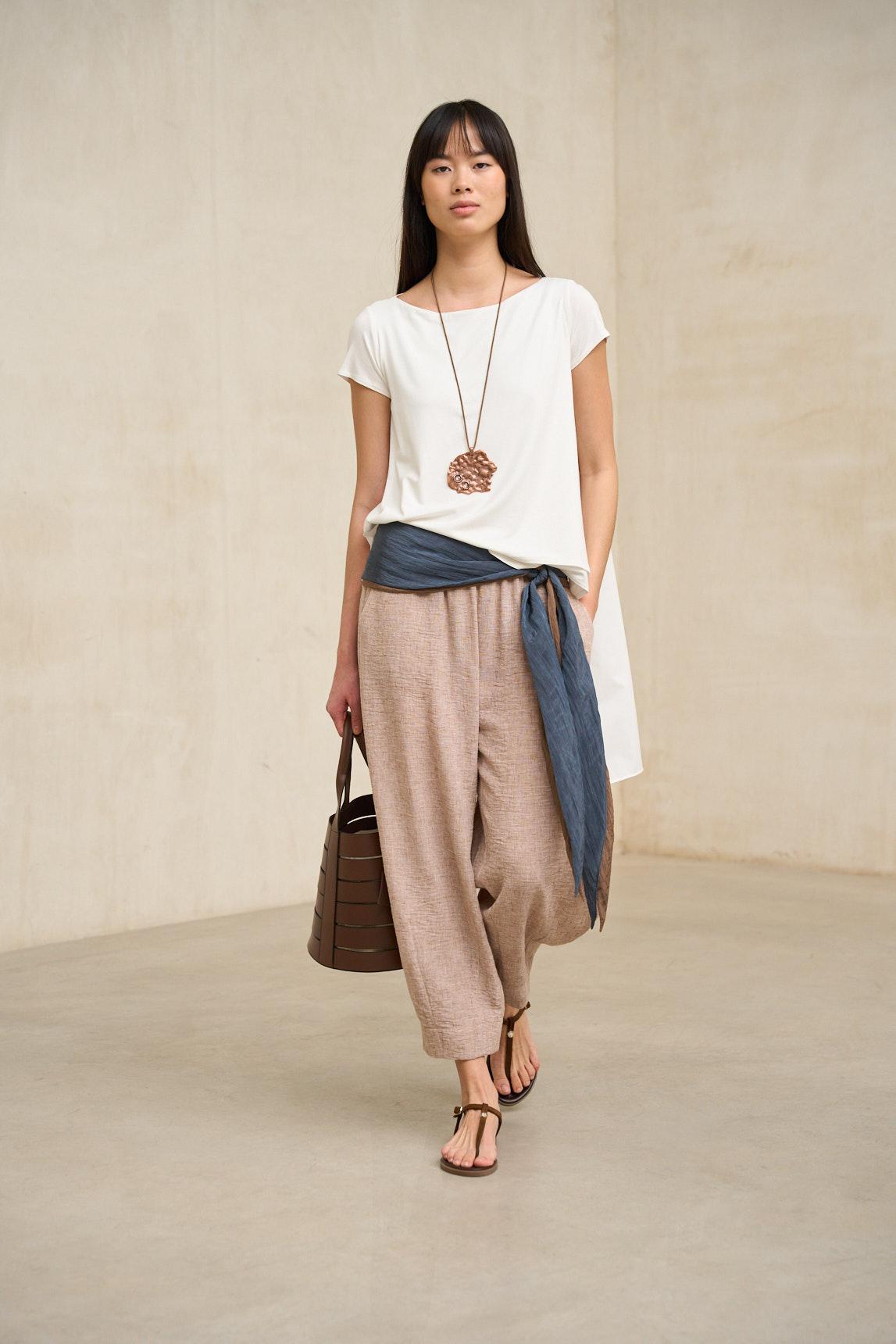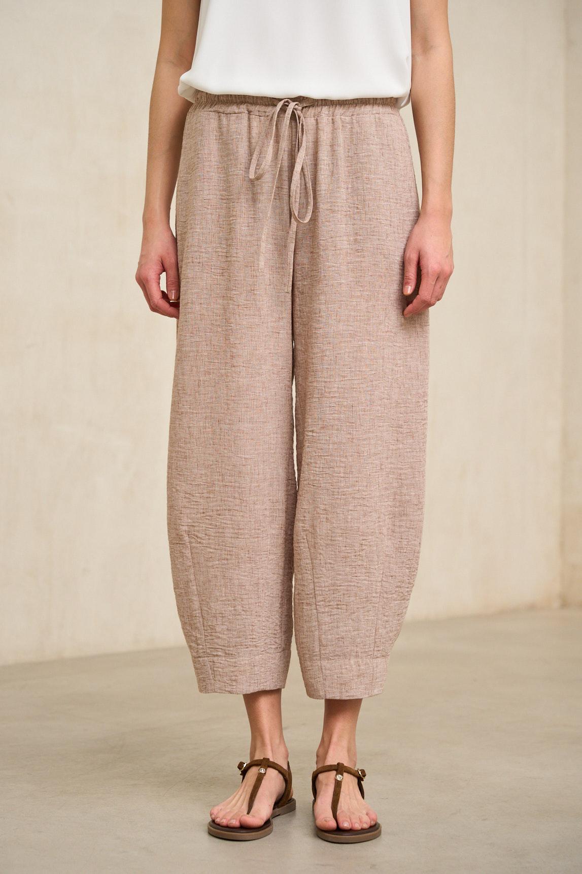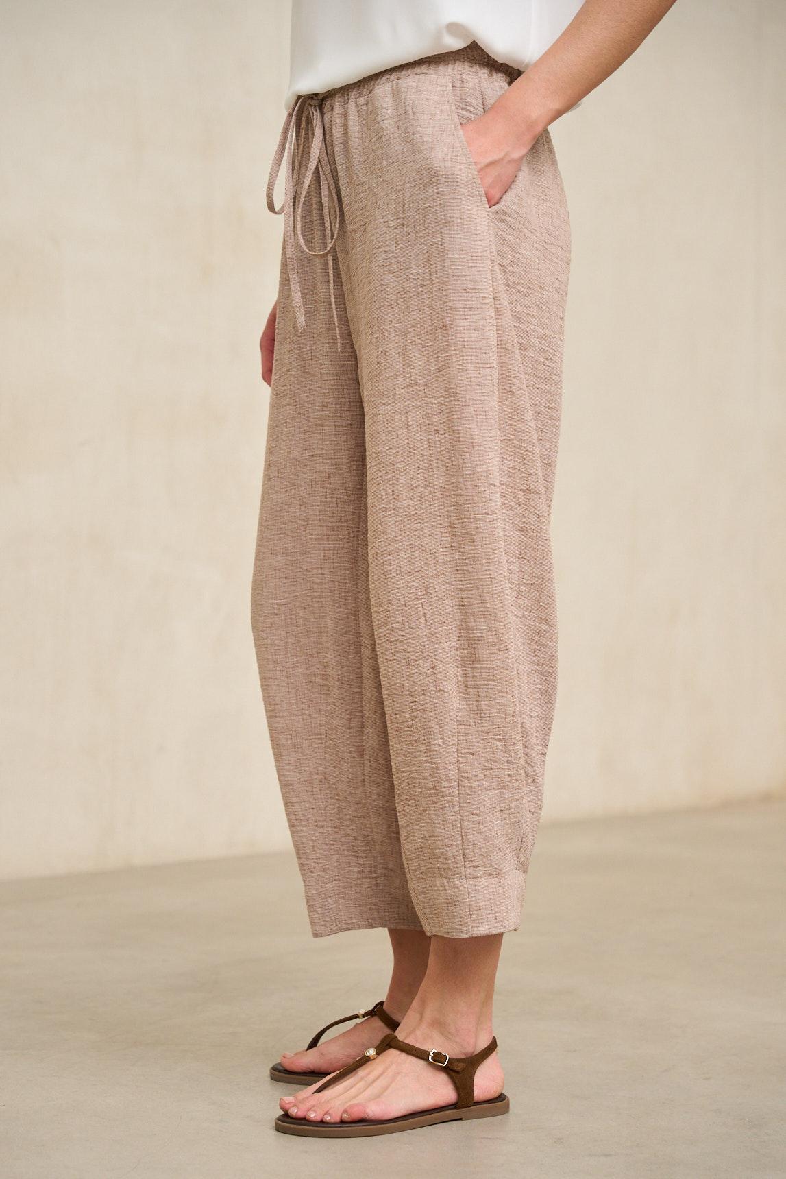 Women's trousers crafted from a lightweight, naturally textured fabric with a fluid drape. They feature an elasticated waistband with gentle ruching and a wide leg that is slightly gathered at the hem, adding volume and balanced movement. Side pockets complete the clean, functional design. The Éldan Sand Trousers stand out for their warm, neutral, and versatile tone. They work especially well with white shirts, off-white blouses, or earth-toned garments, creating harmonious and sophisticated outfits. Their relaxed silhouette adds a modern touch without being over the top. A comfortable and stylish garment that adapts to both urban looks and more natural transitional styles. We strive to display colors as accurately as possible, but they may vary slightly from reality.