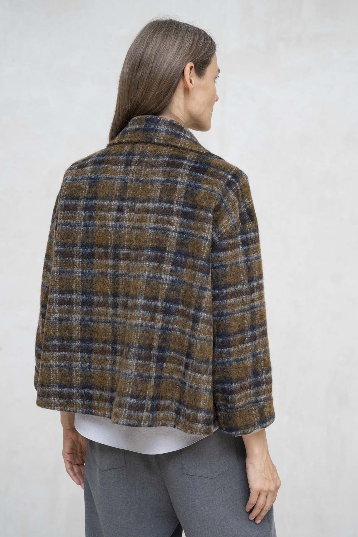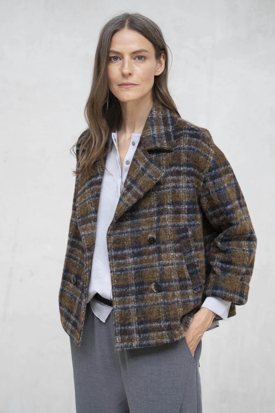 - Short wool coat with a plaid pattern in mustard, blue and brown tones.