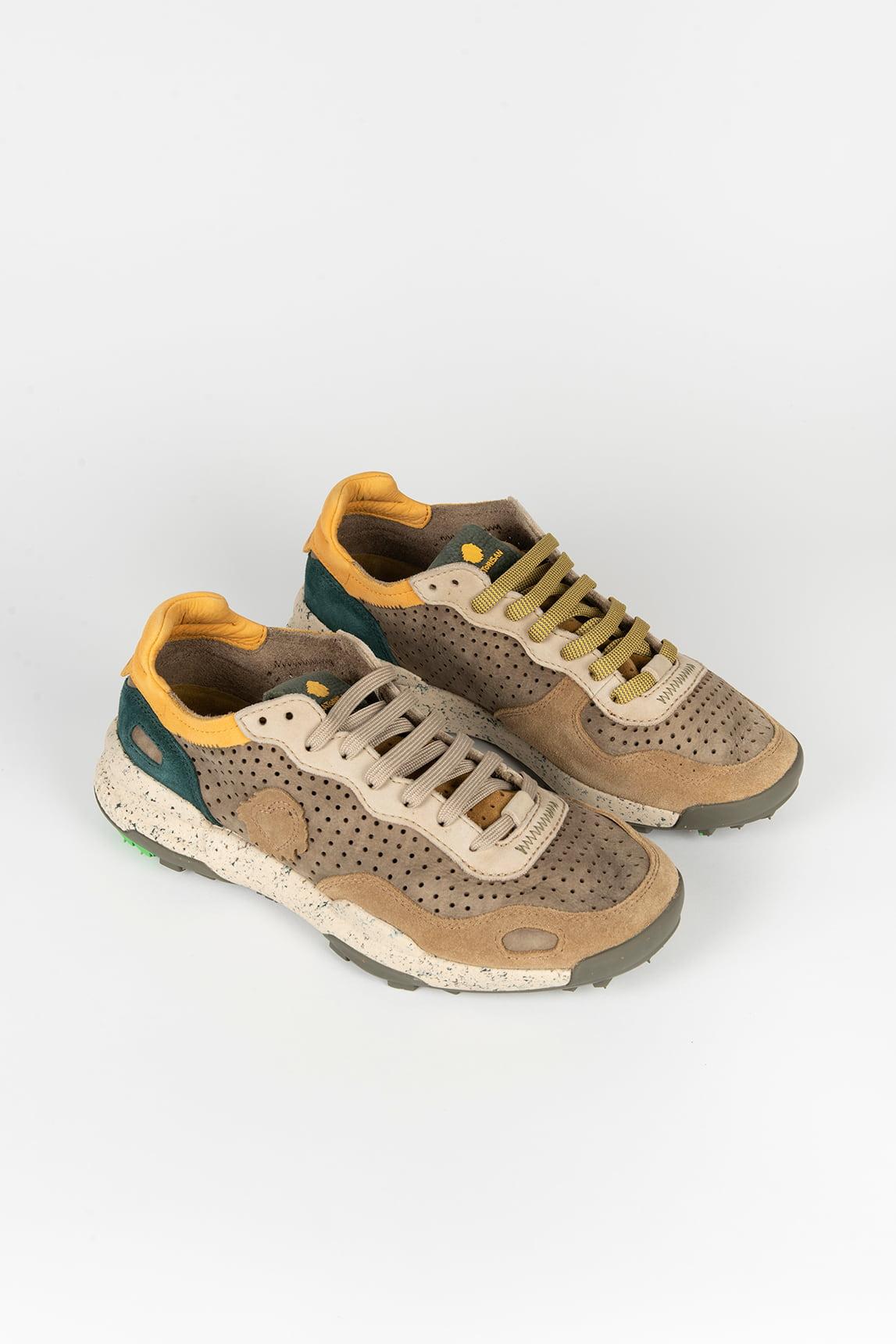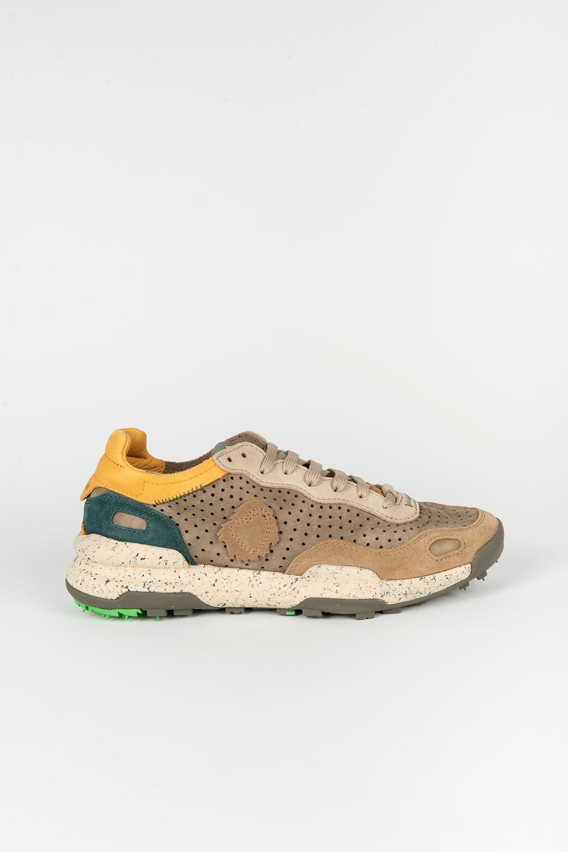 La mezcla de tonos arena, verde y amarillo aporta un carácter orgánico y versátil que conecta con el espíritu aventurero de la marca. Los paneles perforados mejoran la ventilación, mientras que la suela con acabado moteado refuerza su estética natural y proporciona amortiguación y estabilidad en cada paso.