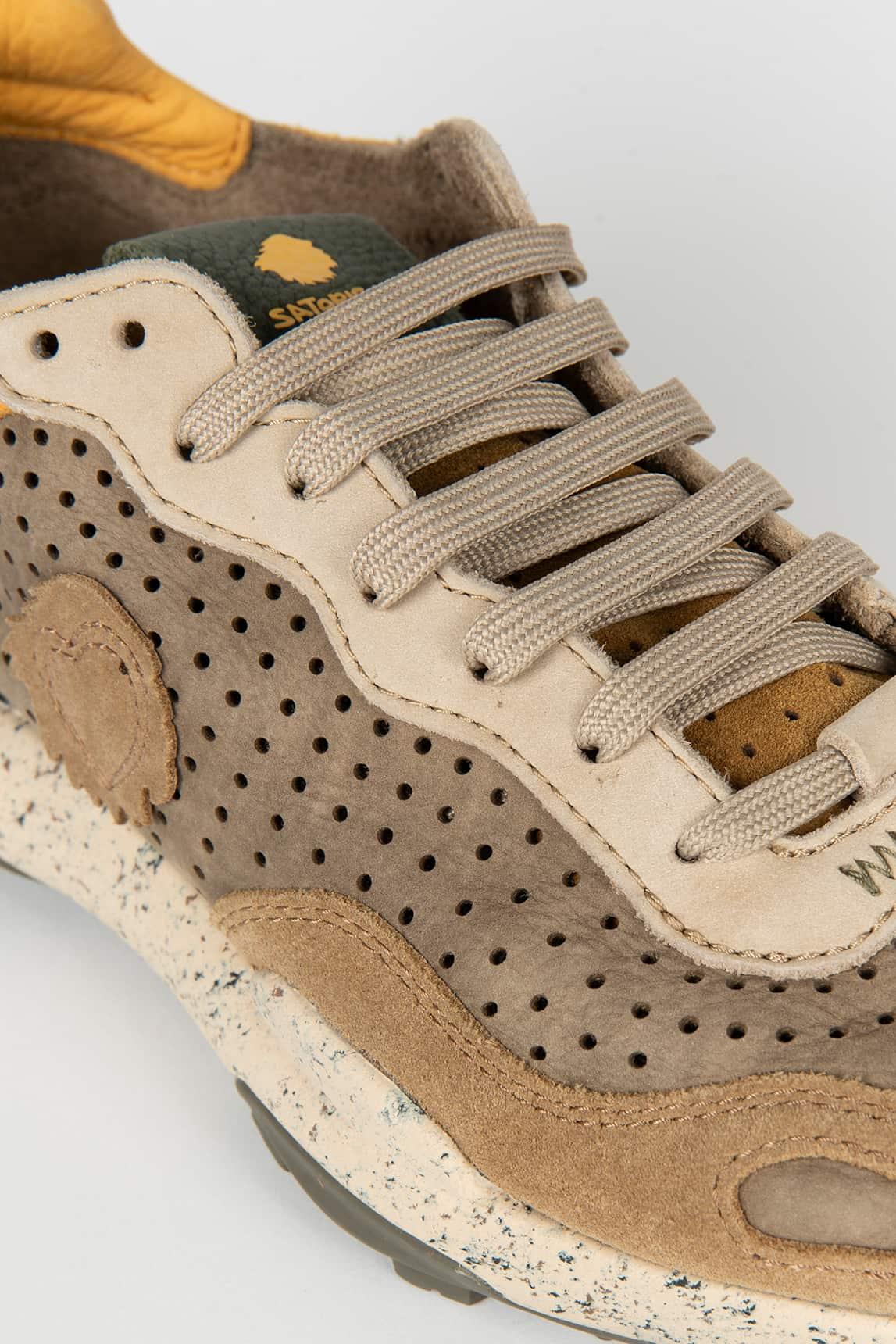Las Satorisan Chacrona Laser Lode reinterpretan la zapatilla outdoor con una estética natural y contemporánea. Su diseño combina piel y serraje perforado con detalles técnicos, creando una silueta ligera y transpirable pensada para el uso diario.