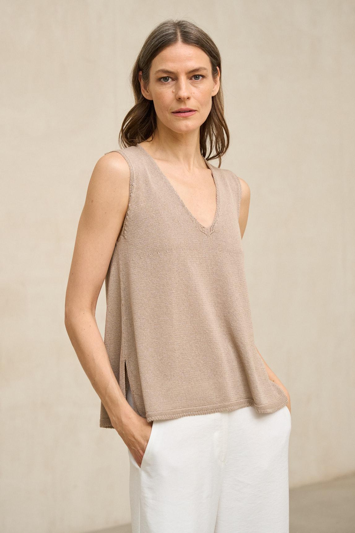 El top de punto Virel arena es una prenda minimalista de líneas limpias que destaca por su silueta depurada y su caída natural. Confeccionado en tejido de punto ligero y suave, presenta escote en pico y diseño sin mangas que estiliza el torso con discreción. Su corte recto y fluido permite que la prenda se adapte al cuerpo sin ceñir, aportando comodidad y equilibrio visual. El tono arena, cálido y luminoso, encaja perfectamente dentro de la paleta neutra de la colección y combina con facilidad con crudos, blancos rotos, camel, verde oliva o gris antracita. Ideal como top base para estilismos monocromáticos o como pieza versátil dentro de conjuntos más estructurados, el top de punto Virel arena es una prenda pensada para primavera y verano. Aporta serenidad, sencillez y coherencia al armario diario. Nos esforzamos por mostrar los colores de la forma más fiel posible, pero pueden variar ligeramente respecto a la realidad.