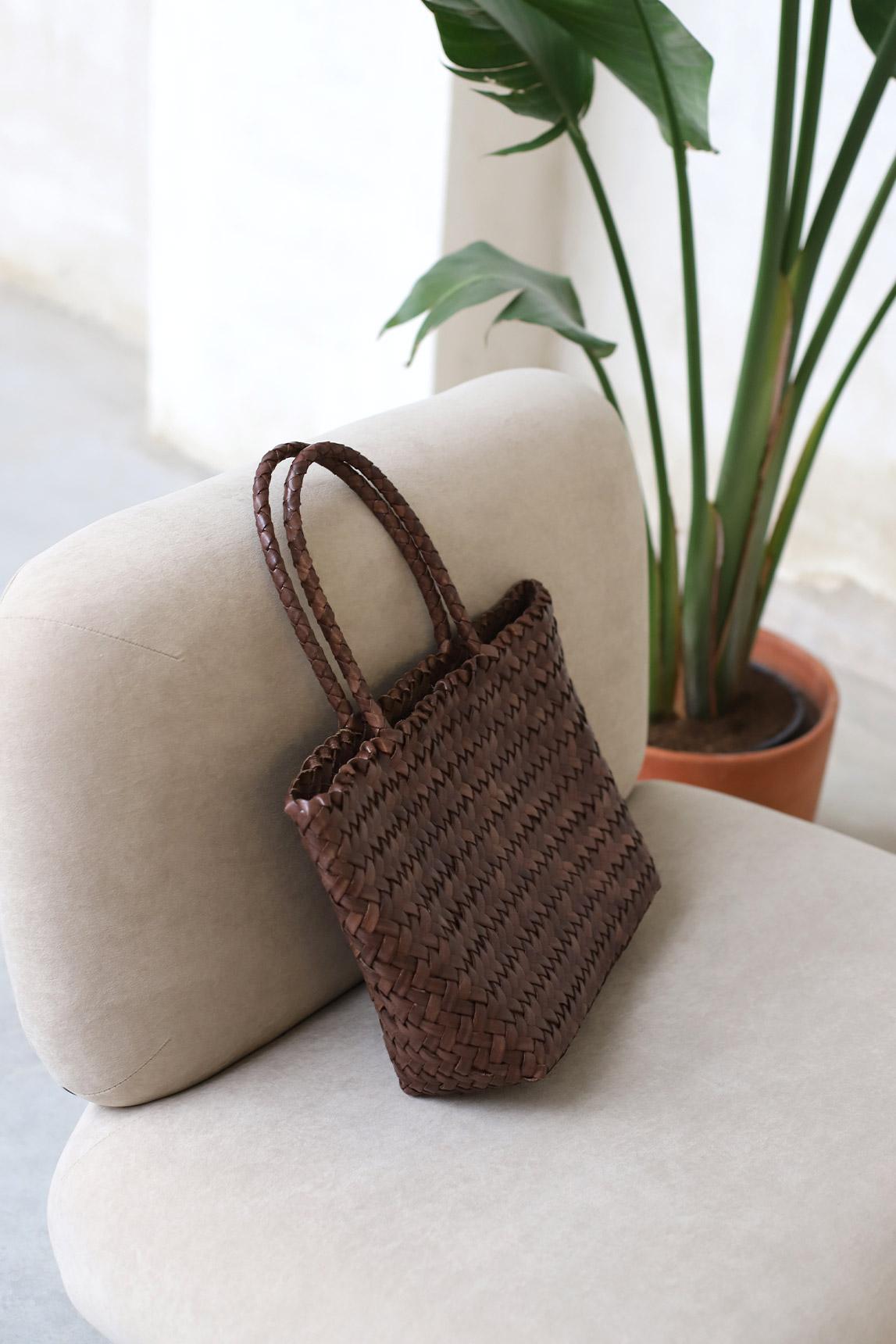 El acabado marrón potencia el aspecto artesanal del trenzado y lo convierte en un básico de fondo de armario: un bolso de piel marrón que nunca pasa de moda.