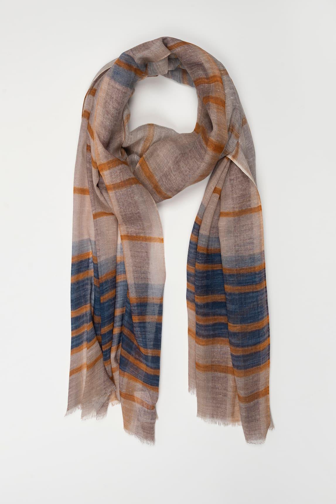 El fular Lumeria Rayas combina un elegante patrón de líneas cruzadas y franjas en tonos arena, azul grisáceo y matices cálidos mostaza. El diseño alterna zonas más suaves con cuadros sutiles, creando un efecto equilibrado entre lo clásico y lo contemporáneo.