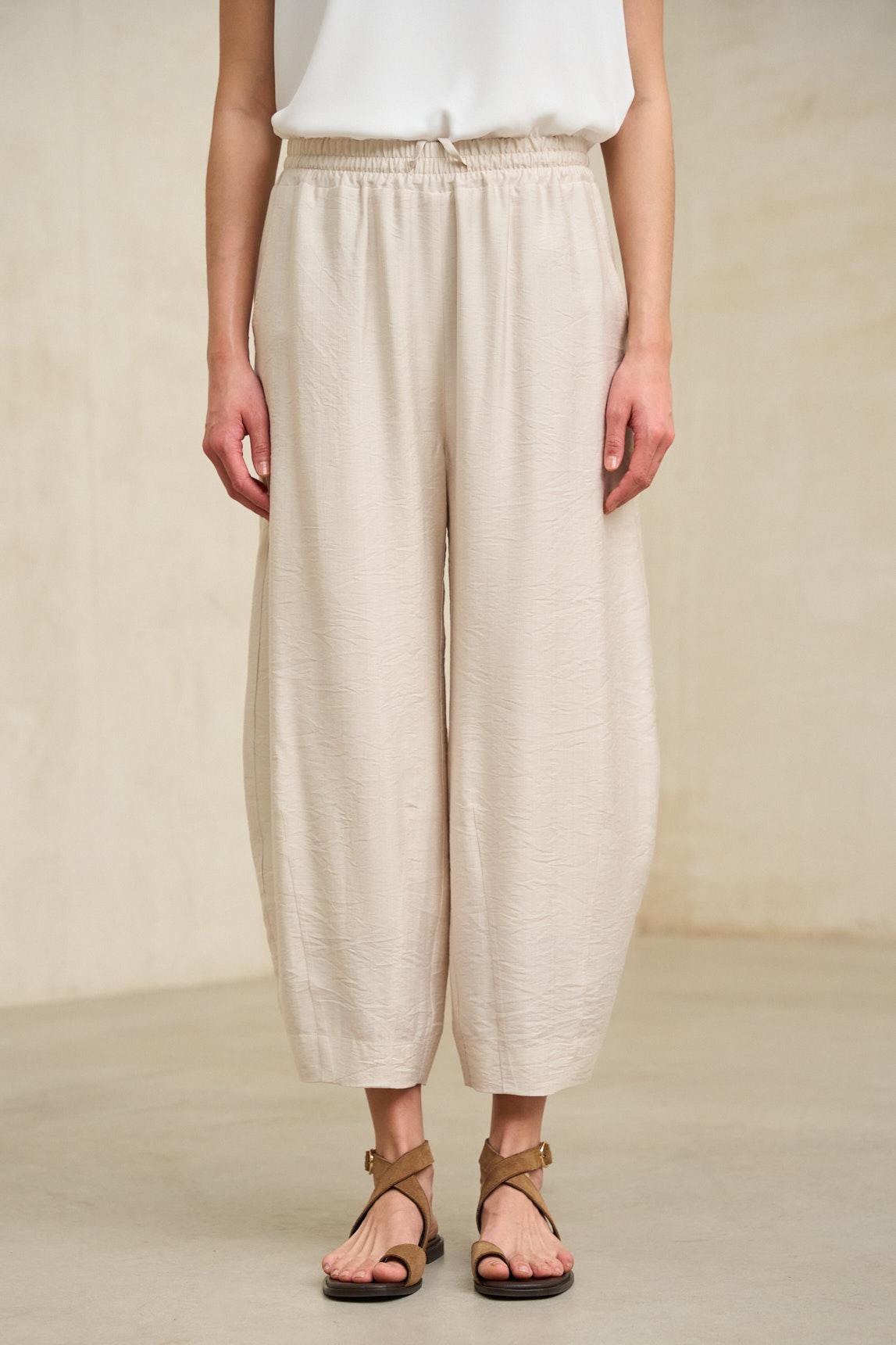 Pantalón de mujer confeccionado en tejido ligero con textura suave y movimiento natural. Presenta cintura elástica con fruncido y silueta bombacho, con pernera amplia de volumen controlado que estiliza la figura manteniendo confort. Incluye bolsillos laterales discretos integrados en la costura.