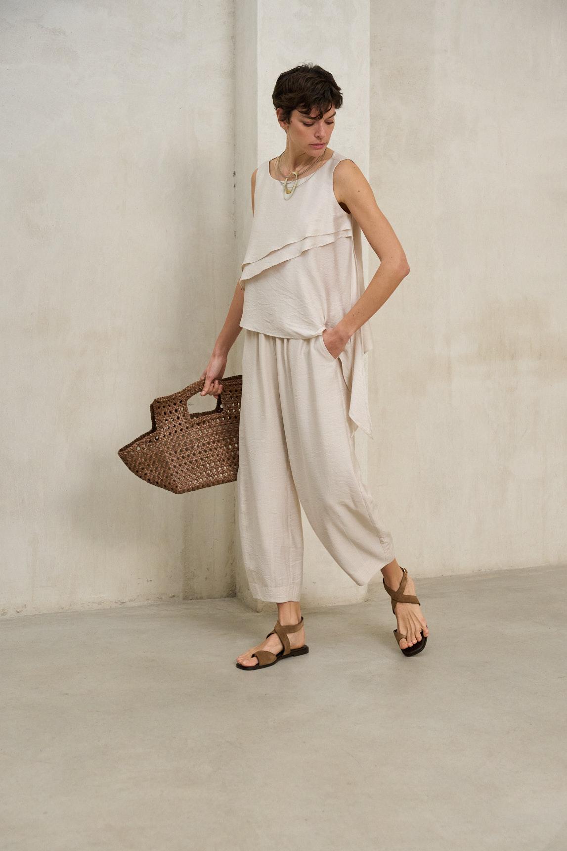 El Pantalón Éldan crudo aporta luminosidad y elegancia serena. Su tono claro permite crear looks monocromáticos sofisticados o combinarlo con colores suaves y naturales para una estética armónica. La silueta bombacho equilibra comodidad y presencia, convirtiéndolo en una pieza clave para primavera y verano.
