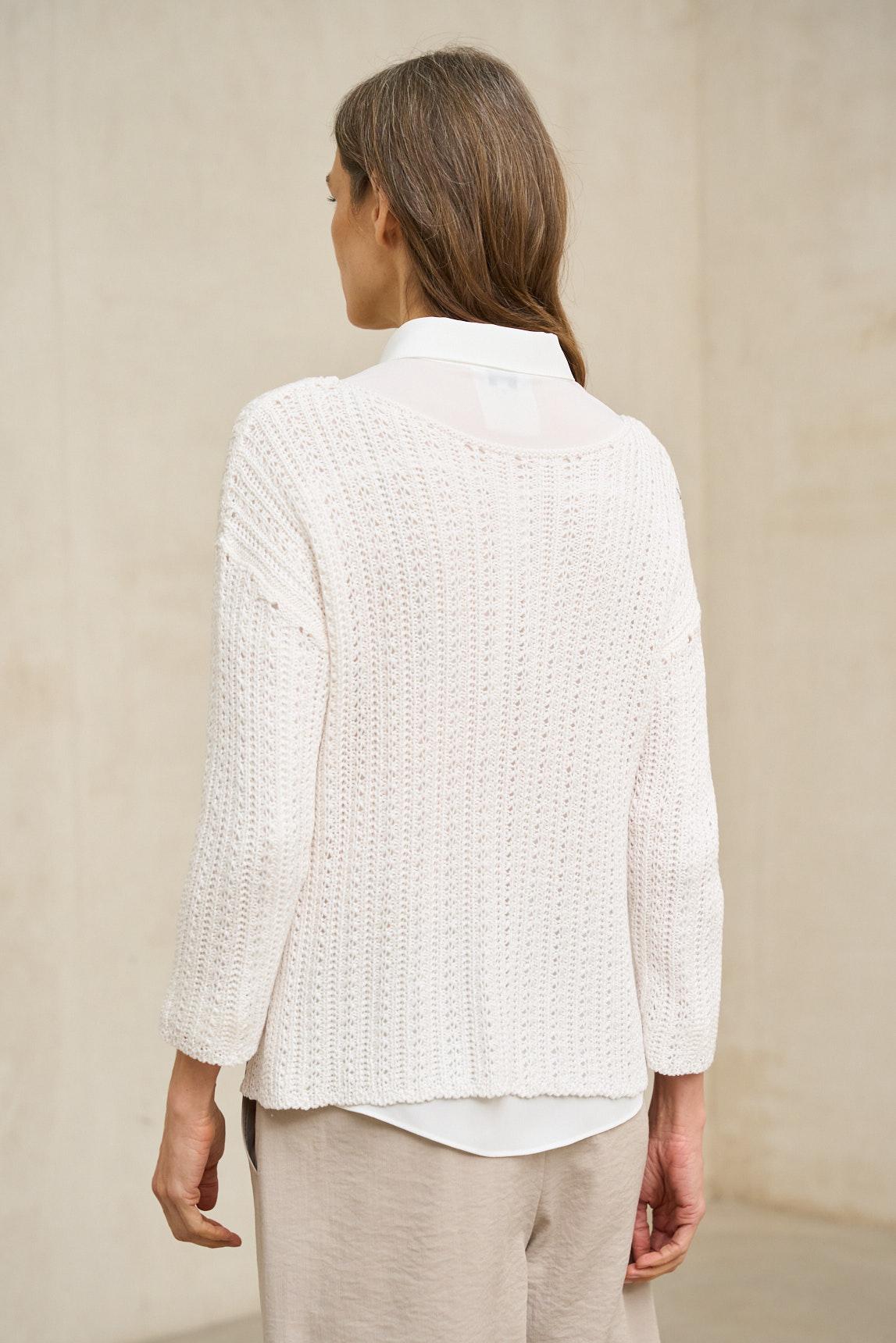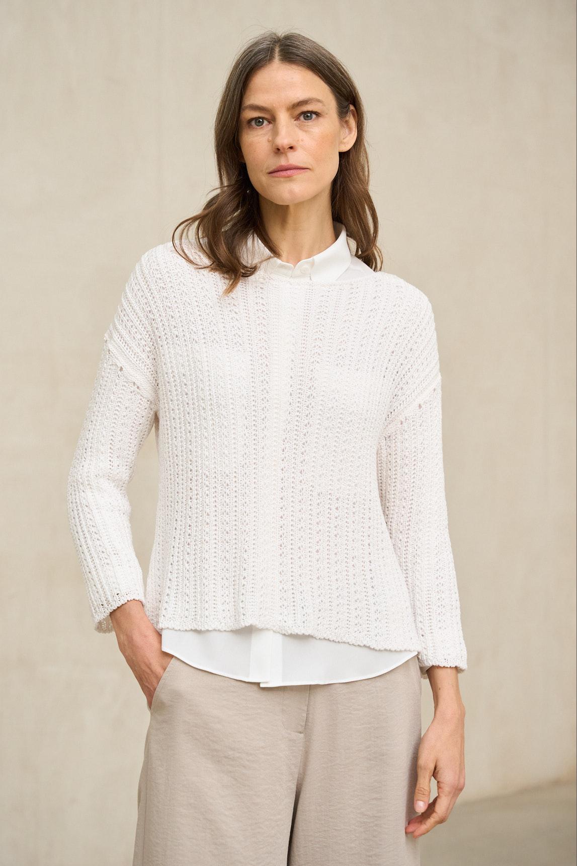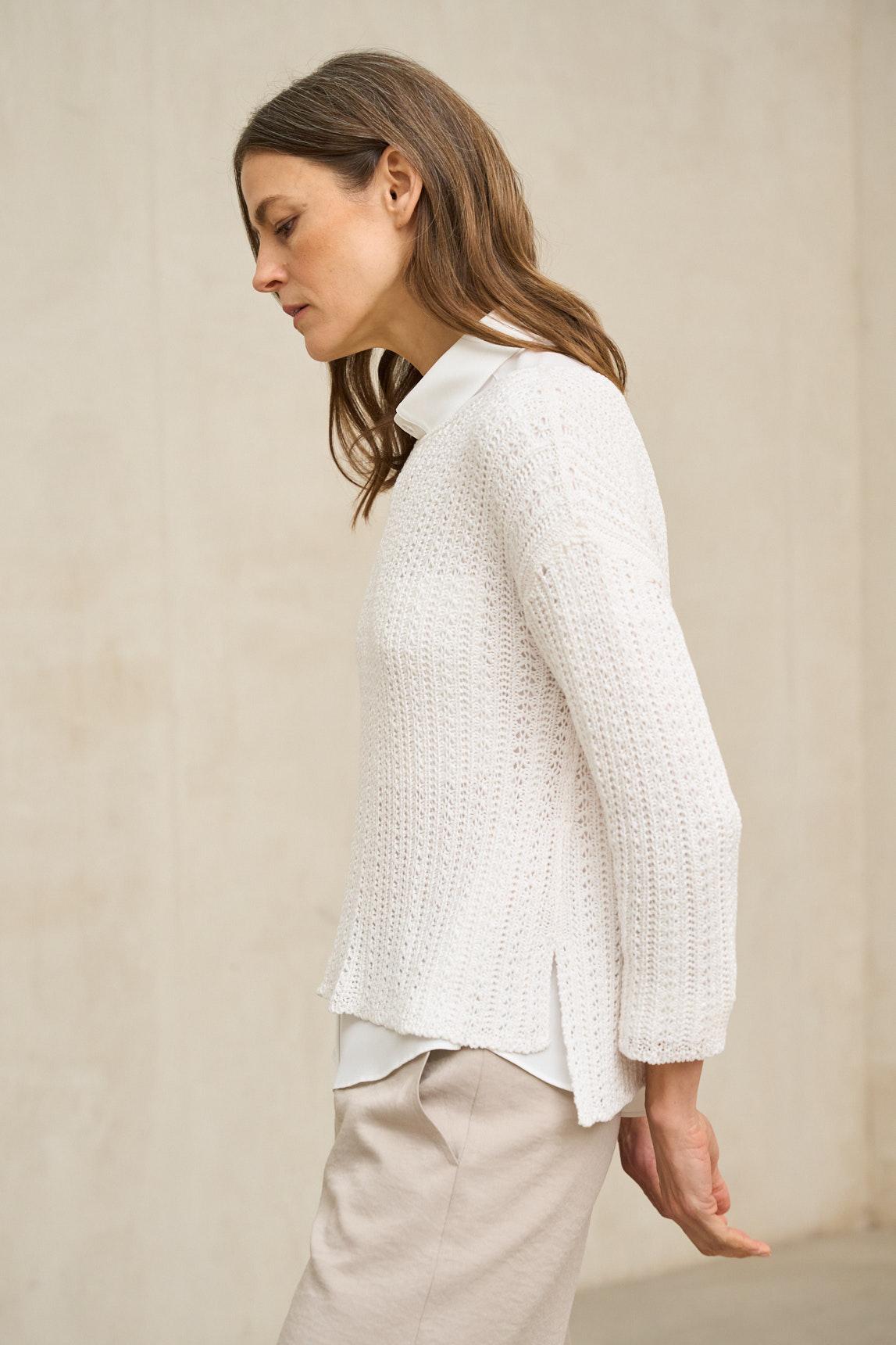 Su estructura liviana lo convierte en una pieza ideal para entretiempo o como capa base bajo chaquetas ligeras. El tono crudo refuerza su carácter luminoso y versátil, combinando con facilidad con pantalones en tonos arena, topo, gris o verde oliva. Una prenda atemporal pensada para construir looks serenos, minimalistas y equilibrados.