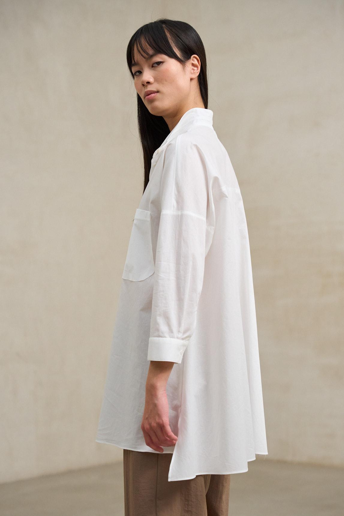 La Camisa Nerela blanco reinterpreta la camisa clásica en una versión más relajada y contemporánea. Confeccionada en tejido ligero y fluido, presenta cuello camisero, escote ligeramente abierto sin botonadura visible completa y manga larga con puño sencillo. Su silueta amplia y su bajo recto aportan comodidad y movimiento, permitiendo llevarla tanto suelta como ligeramente remetida para estructurar el look. El diseño limpio del delantero, con apertura parcial tipo tapeta, mantiene una estética depurada y versátil.