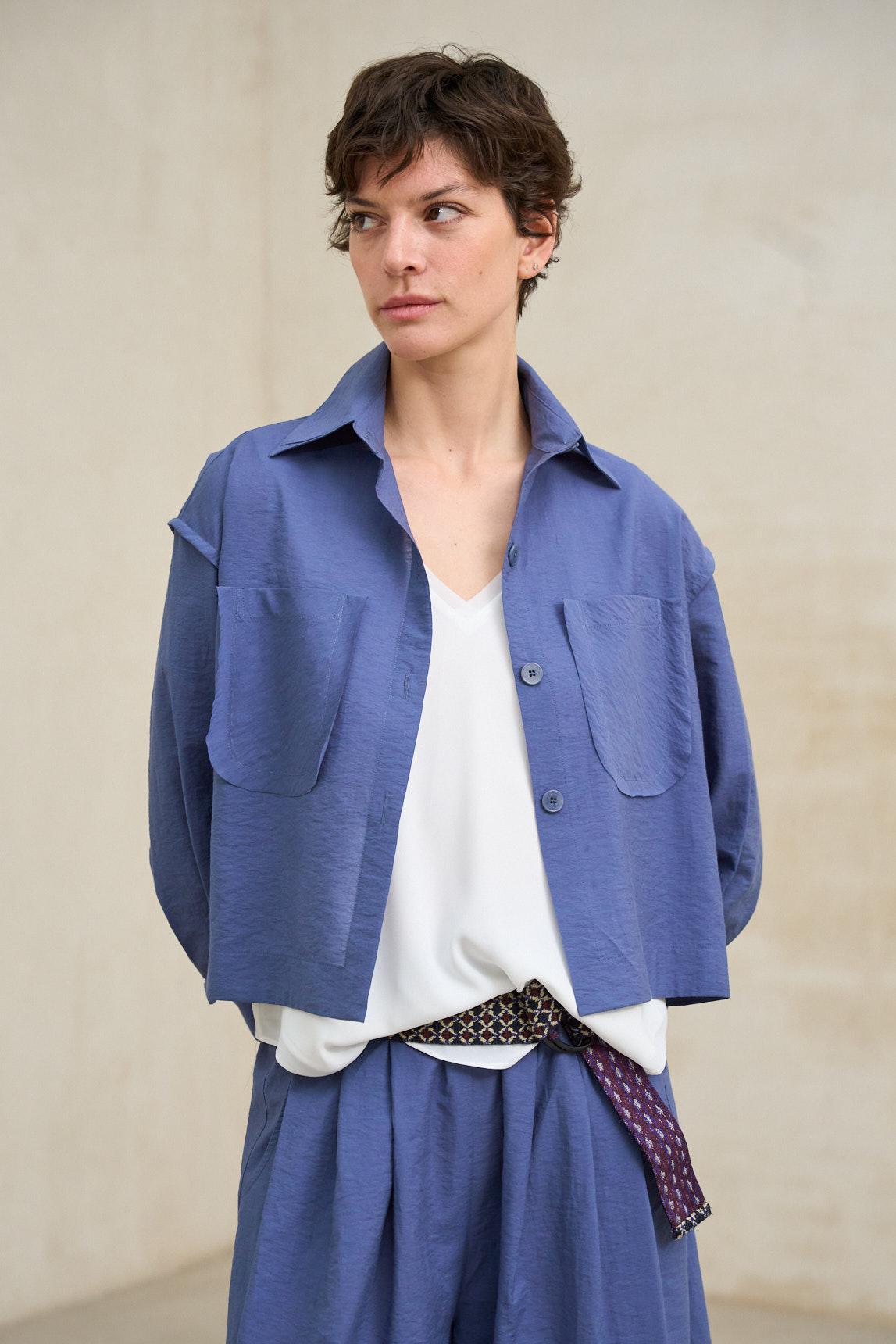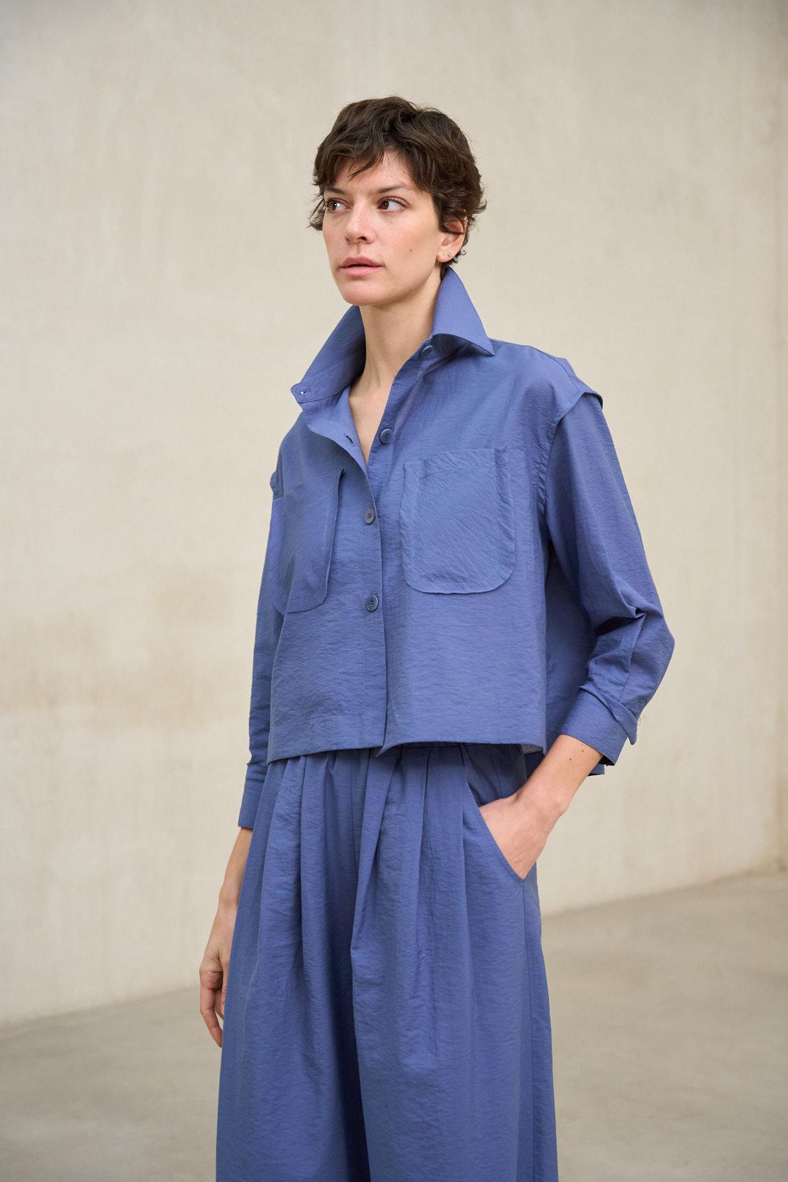 El tono azul marino, profundo y versátil, aporta carácter al look y combina fácilmente con blancos, crudos, arena o tonos tierra. La Camisa Brisa es una pieza práctica y atemporal, ideal para completar estilismos informales con pantalones amplios, denim o conjuntos coordinados, aportando estructura sin rigidez.