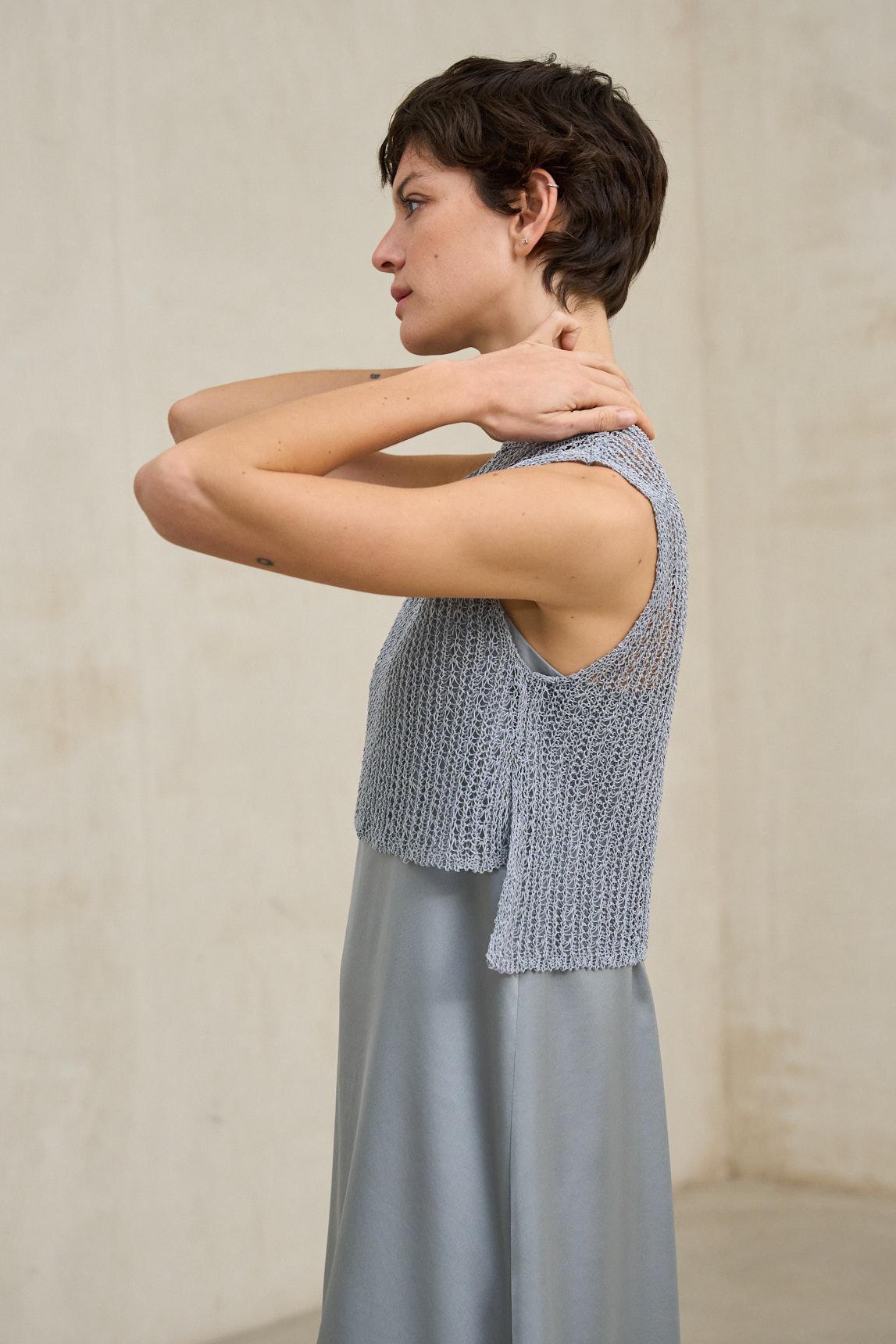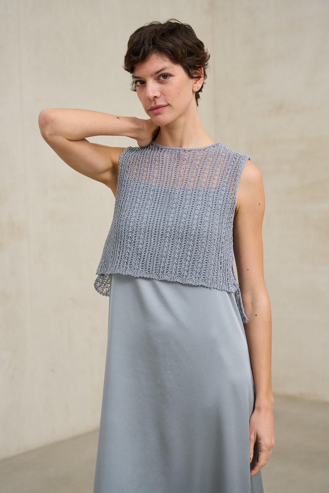 Presenta cuello redondo y diseño sin mangas, con una silueta recta y limpia que equilibra la textura del tejido. Su estructura ligera lo convierte en una pieza ideal para superposición, aportando profundidad visual sin añadir peso al conjunto.