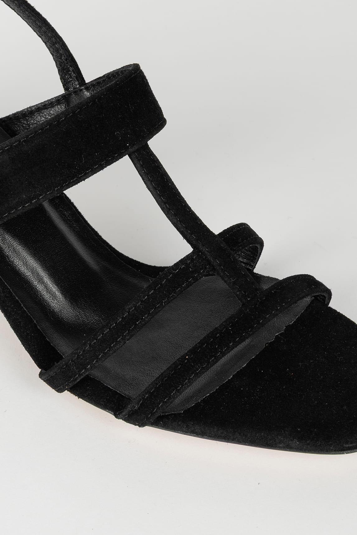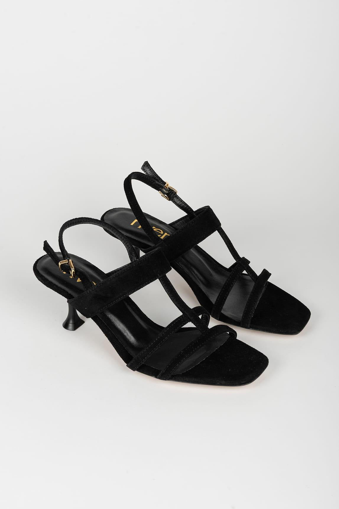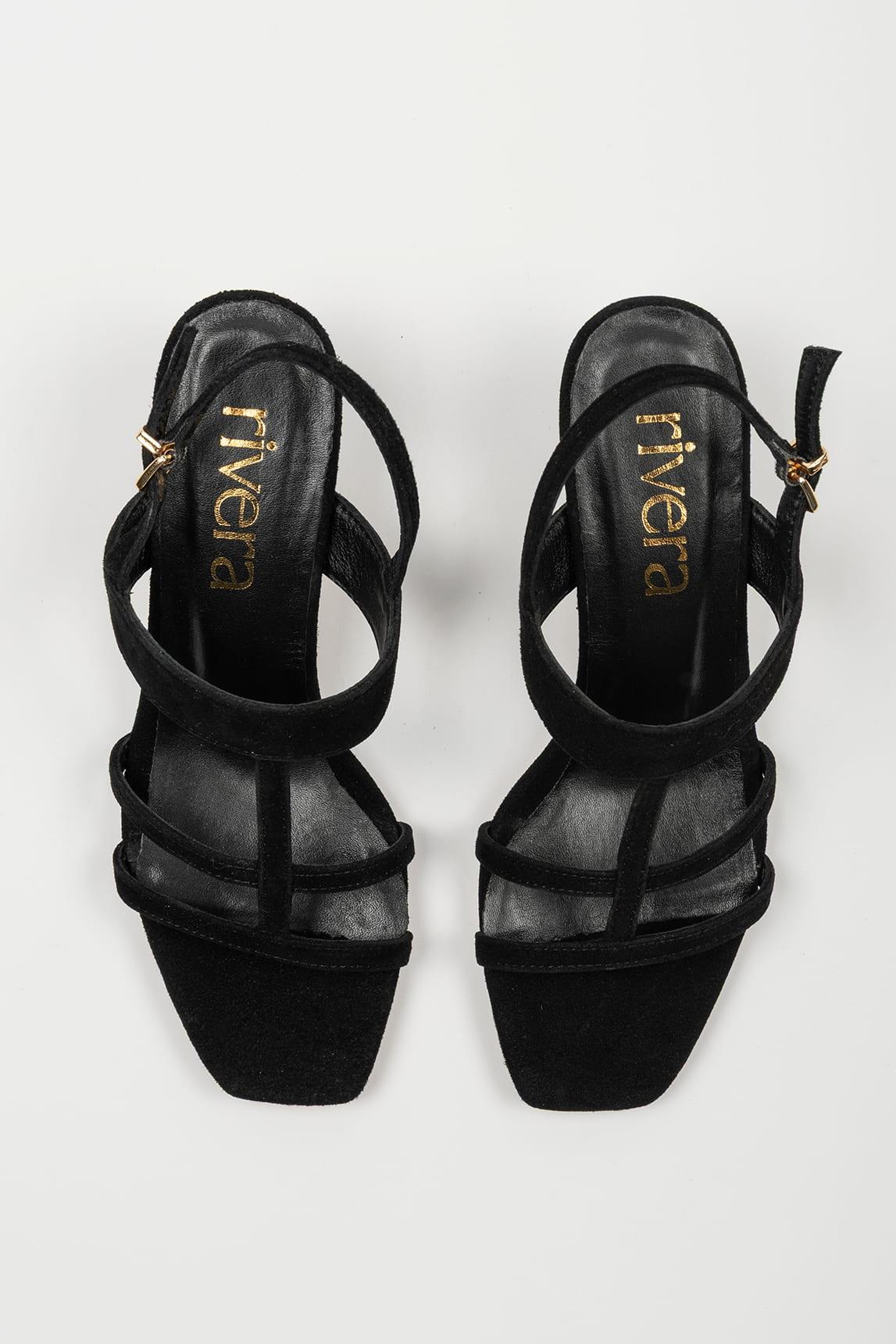La sandalia Caleth Negra mantiene la arquitectura estilizada del modelo, con un juego de tiras finas que estructuran el empeine creando una silueta limpia y contemporánea. La combinación de líneas horizontales y la banda superior aporta equilibrio y carácter refinado.