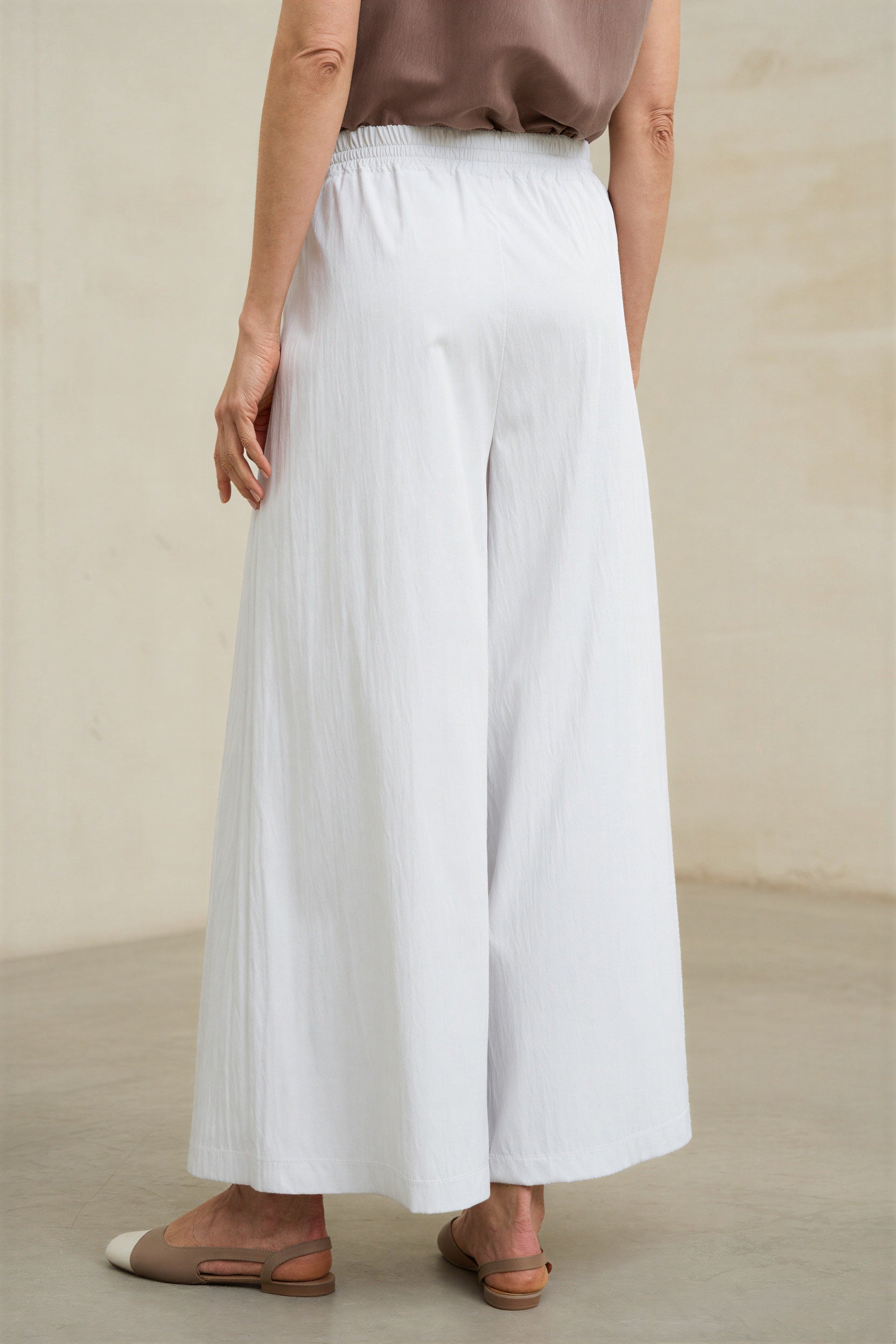 Pantalón de mujer confeccionado en tejido ligero con textura arrugada de aspecto natural, suave al tacto y con una caída fluida. Presenta cintura elástica con cordón ajustable que permite un ajuste cómodo y adaptable. Incorpora bolsillos laterales funcionales y pernera recta amplia que aporta movimiento y una silueta relajada.