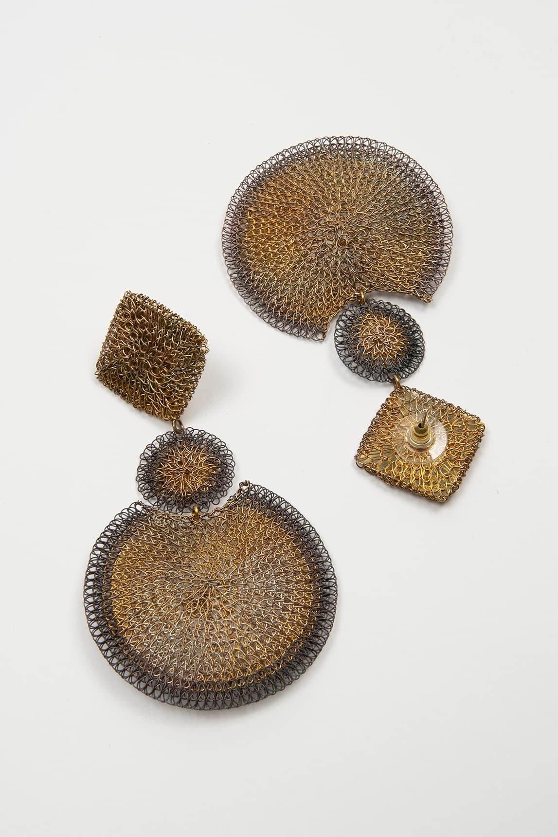 - Pendientes geométricos elaborados en malla metálica con efecto bicolor dorado y gris envejecido.