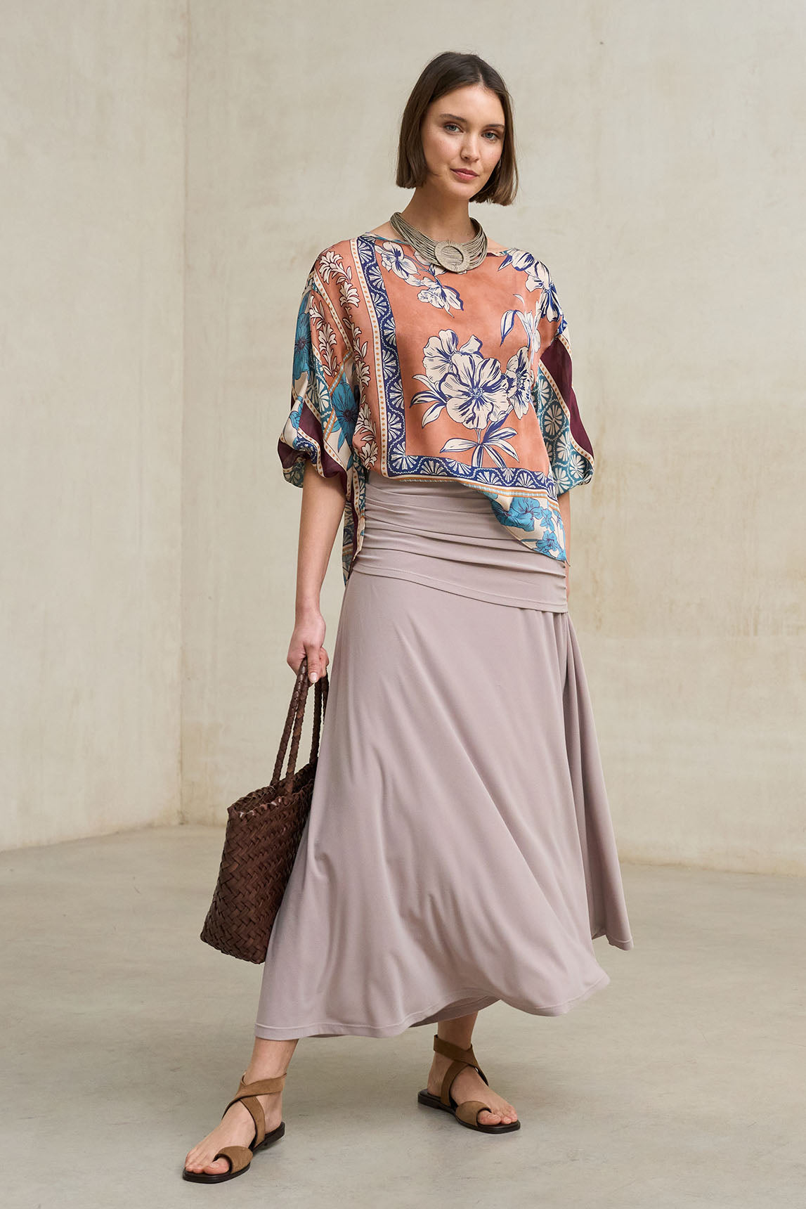 La Blusa Avenia estampado combina un diseño fluido con un patrón artístico en tonos terracota, azul verdoso y matices neutros, creando una pieza con carácter pero fácil de integrar en el armario. Su estampado dialoga con la falda a juego, permitiendo construir un conjunto coordinado con efecto vestido.
