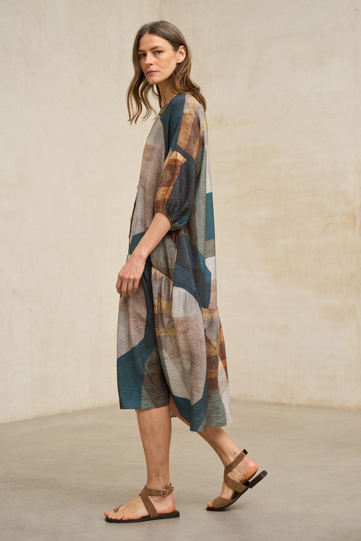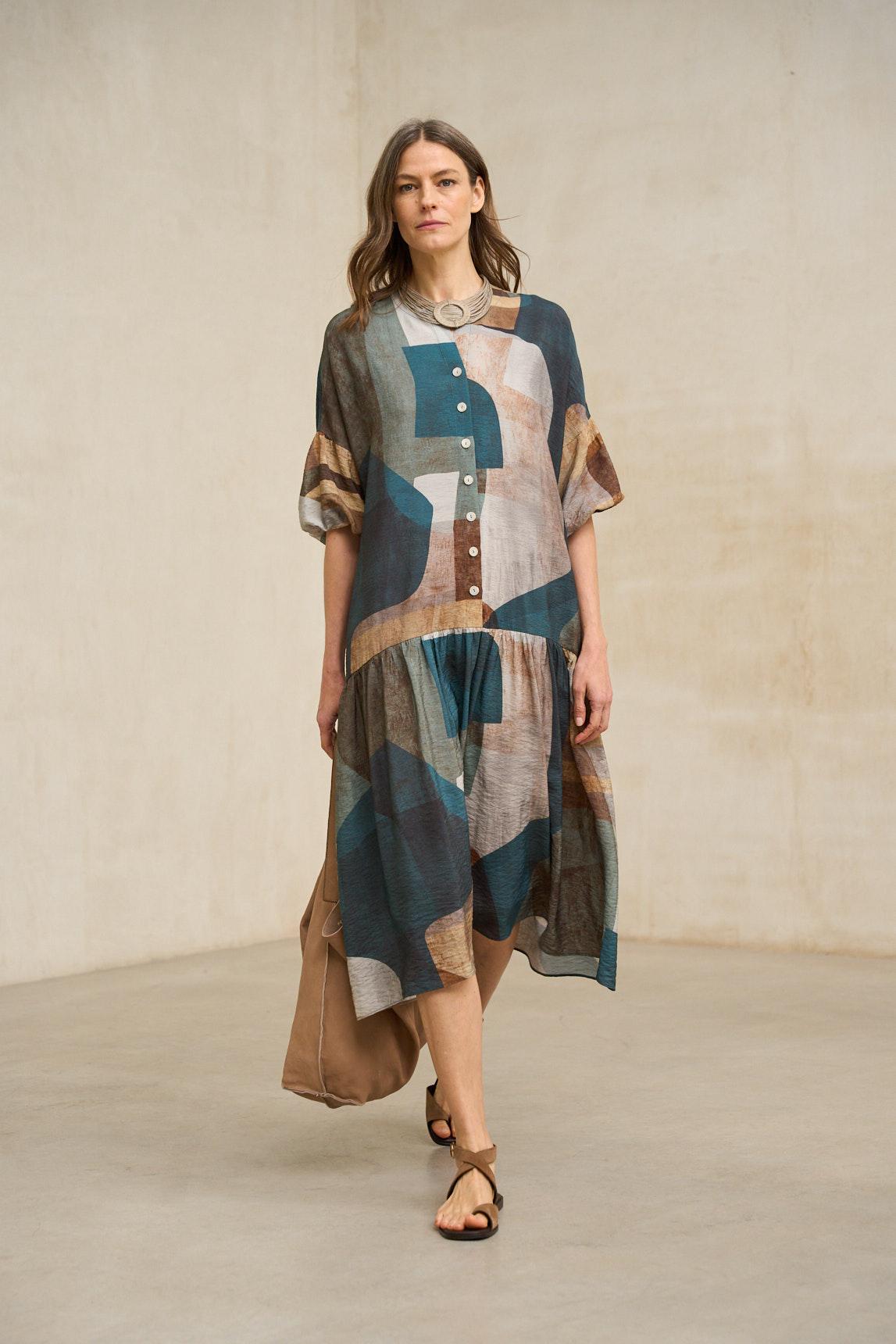 El vestido Elvina estampado abstracto destaca por su diseño fluido y su juego cromático en tonos verdes, azul petróleo y matices tierra sobre base clara. Su silueta amplia y recta aporta movimiento y ligereza, creando una caída natural que estiliza sin ceñir.