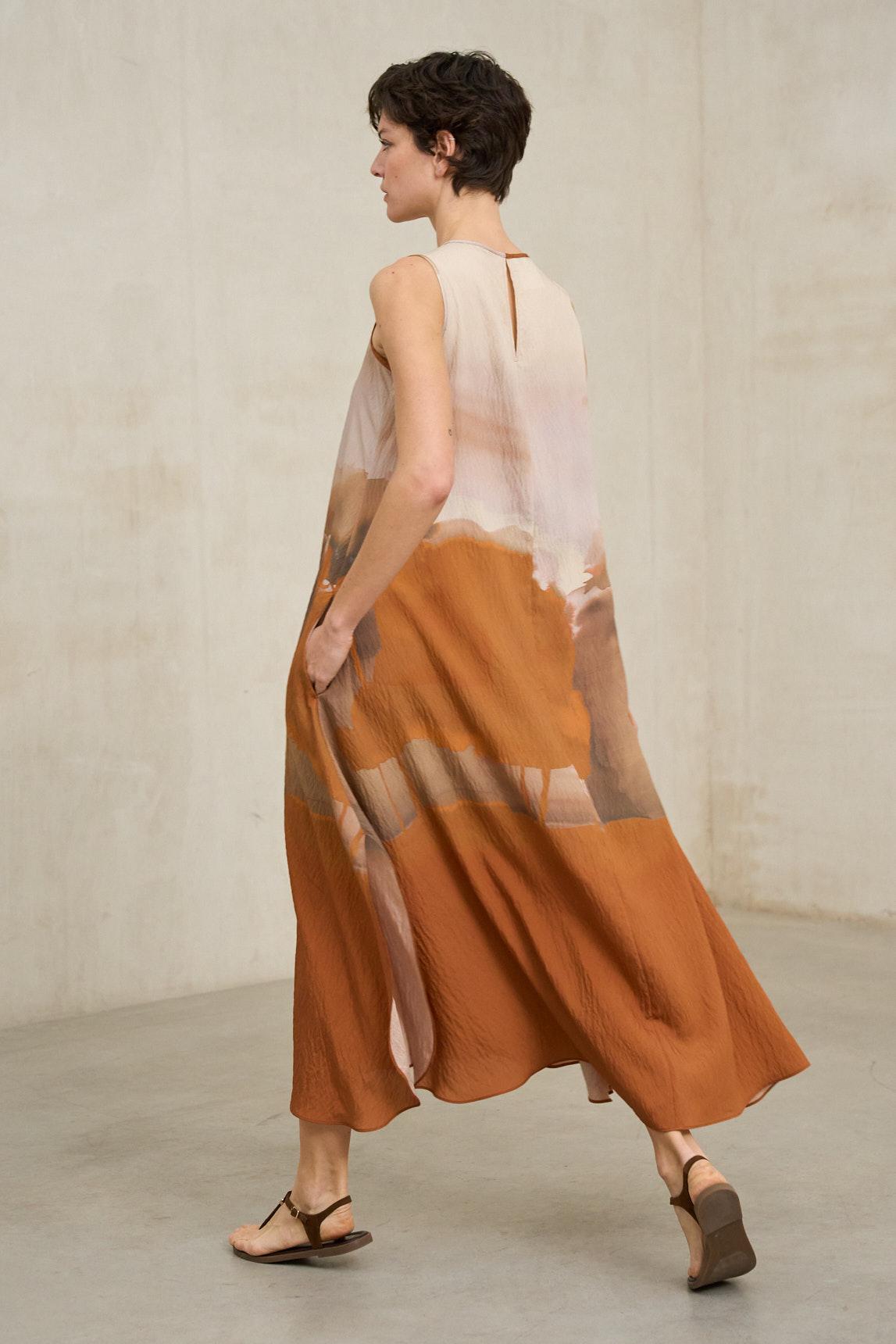 El vestido Lurea degradado terracota es una pieza fluida de inspiración artística que destaca por su efecto acuarela en tonos tierra, arena y blanco suave. Su diseño sin mangas y escote redondeado aporta limpieza visual, mientras que la silueta amplia y evasé genera movimiento y ligereza en cada paso. El estampado degradado crea una transición cromática orgánica que aporta profundidad sin recargar el conjunto. El corte amplio y el tejido ligero favorecen la caída natural, convirtiéndolo en una opción cómoda y versátil para los meses cálidos. Ideal para estilismos relajados con sandalias planas o cuñas naturales, el vestido Lurea equilibra frescura y sofisticación. Puede acompañarse de bolsos de rafia o complementos en tonos neutros para potenciar su estética cálida y mediterránea. Nos esforzamos por mostrar los colores de la forma más fiel posible, pero pueden variar ligeramente respecto a la realidad.