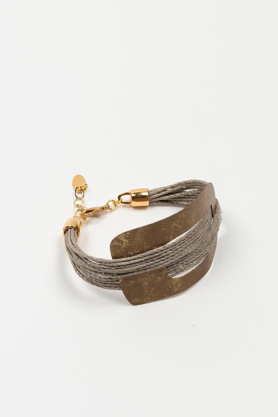 El brazalete Eldara destaca por su diseño estructurado de base ancha metálica combinada con múltiples hilos finos superpuestos en la parte frontal. La superposición de líneas crea una textura rica y envolvente que aporta profundidad y carácter a la pieza.