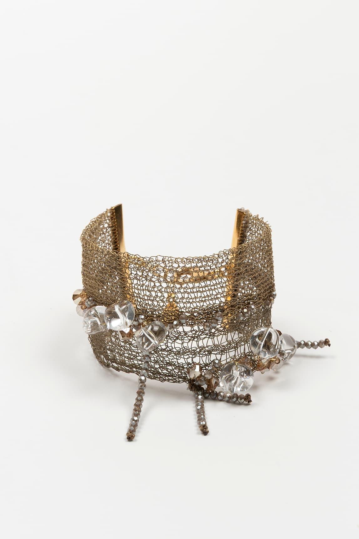 Los pequeños elementos decorativos en la parte frontal añaden carácter y un aire artesanal, generando un sutil juego de brillo al moverse. Su estructura abierta permite que se adapte cómodamente a la muñeca, convirtiéndolo en una pieza protagonista.