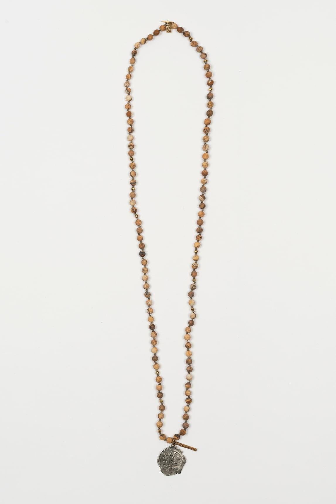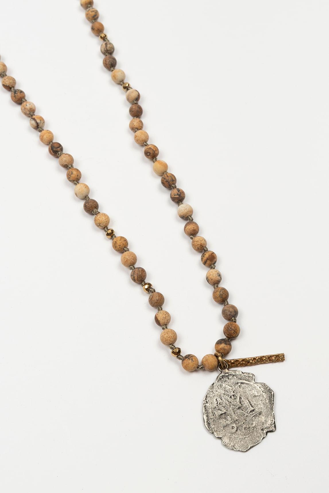 Collar de mujer con cuentas en tono arena de aspecto natural y pequeñas piezas metálicas intercaladas. El diseño incorpora un colgante de forma orgánica en metal con textura irregular, acompañado por una barra decorativa que aporta un detalle artesanal. Su acabado genera una estética cálida, suave y muy fácil de combinar.
