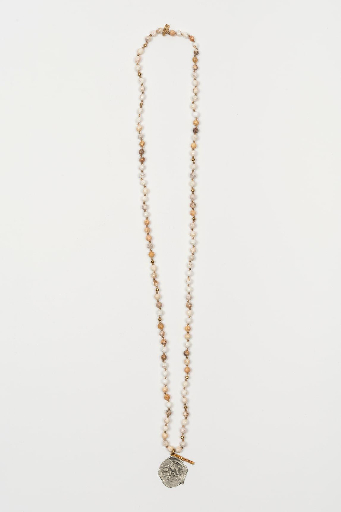 Collar de mujer con cuentas en tono beige claro y pequeñas piezas metálicas intercaladas. El diseño se completa con un colgante de forma orgánica en metal texturizado acompañado por una barra decorativa, aportando un aire artesanal y equilibrado. Su acabado genera una estética luminosa y natural.