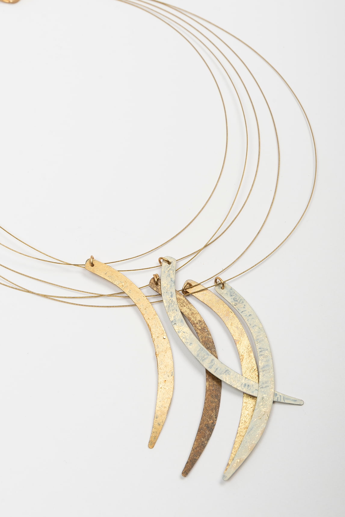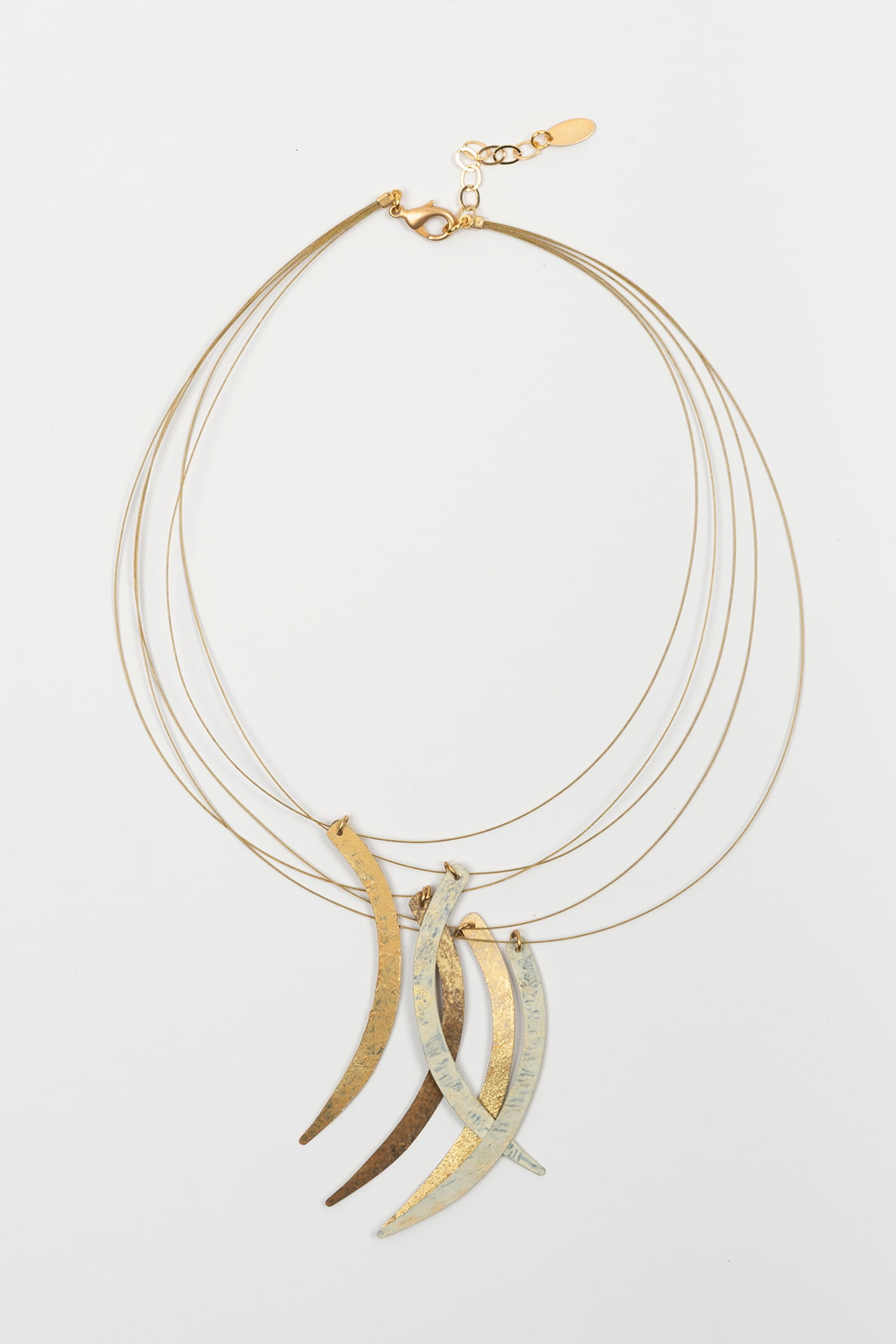 Collar de varias hebras finas en tono dorado con cierre de mosquetón y cadena extensora, pensado para ajustar la altura con facilidad. En la parte frontal, un conjunto de colgantes alargados y curvos cae en capas, alternando acabados metalizados con efecto texturizado que aporta brillo suave y matices a cada pieza. La composición queda ligera, con movimiento, y concentra el detalle en el centro sin recargar el resto del contorno.