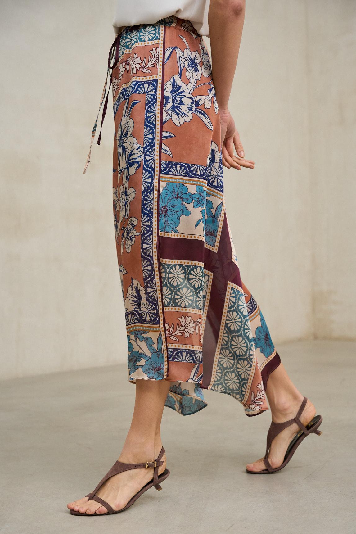 Falda midi confeccionada en tejido ligero con movimiento fluido y caída natural. Presenta diseño asimétrico con picos irregulares que aportan dinamismo y un aire desenfadado al conjunto. El estampado combina tonos terracota, azul verdoso y matices neutros en un patrón artístico de inspiración artesanal que aporta carácter sin resultar recargado.
