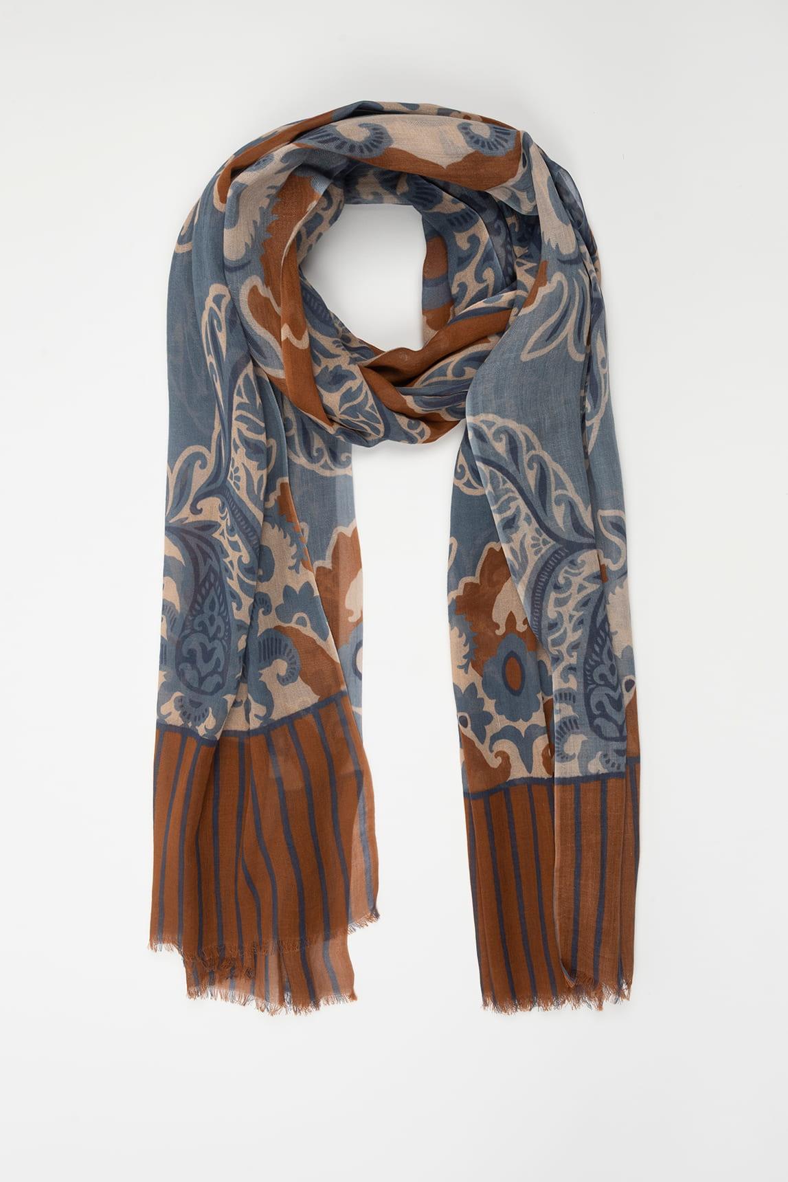 El Fular Zairel azul terracota destaca por su estampado ornamental de inspiración artística, donde se combinan motivos orgánicos en azul empolvado con detalles en terracota y matices cálidos. El contraste cromático aporta profundidad visual sin perder armonía.