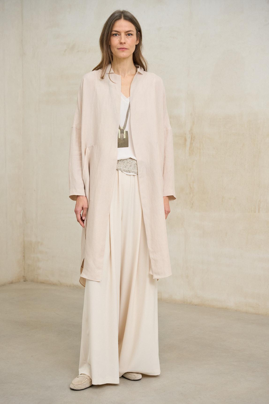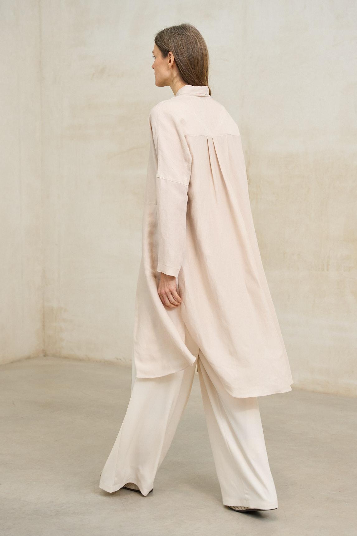 La levita Lirael crudo empolvado es una prenda ligera de líneas limpias y caída fluida, pensada para completar estilismos elegantes con un aire sofisticado y minimalista. Su diseño abierto, sin cierre visible, permite que el tejido acompañe el movimiento con naturalidad.
