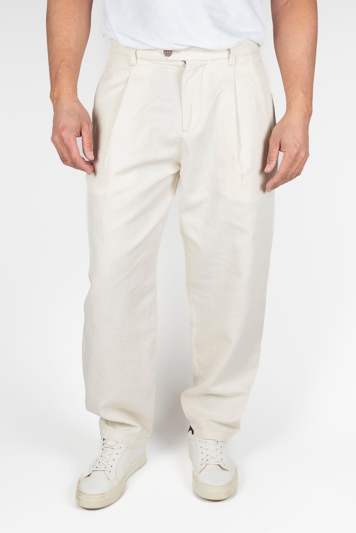 p>Este pantalón en tono blanco roto presenta una silueta estructurada con pernera larga y caída recta que aporta una imagen limpia y equilibrada. El cierre frontal con botón visible y cremallera se combina con trabillas para cinturón, mientras las pinzas delanteras añaden un sutil volumen en la parte superior que define la forma con elegancia. Los bolsillos laterales y el tejido de apariencia ligeramente texturizada refuerzan su estética cuidada, con un acabado uniforme que transmite luminosidad y sobriedad.
