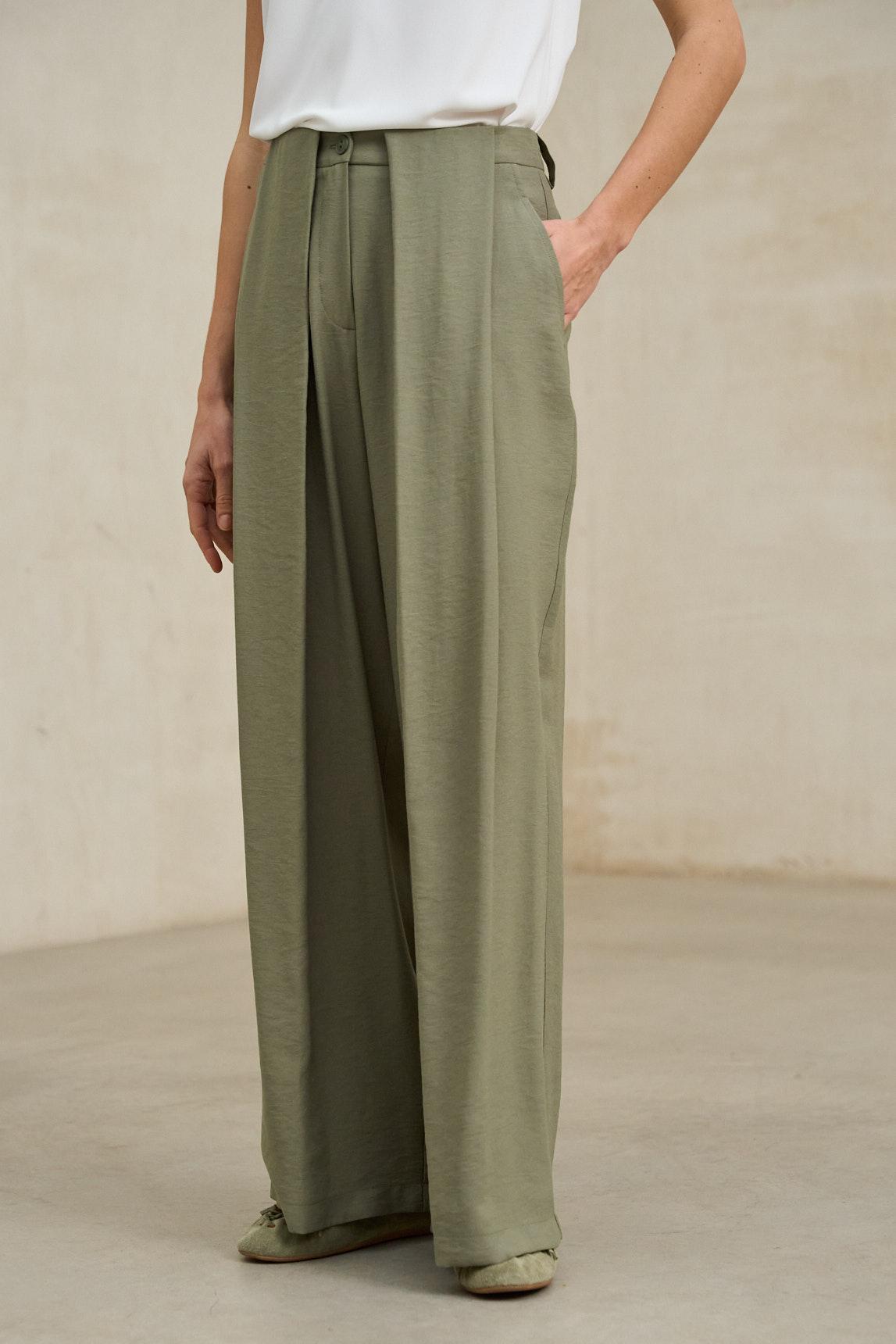 Este pantalón presenta una silueta amplia y recta, definida por pinzas frontales profundas que aportan volumen y una caída fluida desde la cintura. El diseño incorpora cierre frontal con botón visible y una estructura ligera que acompaña el movimiento sin rigidez.
