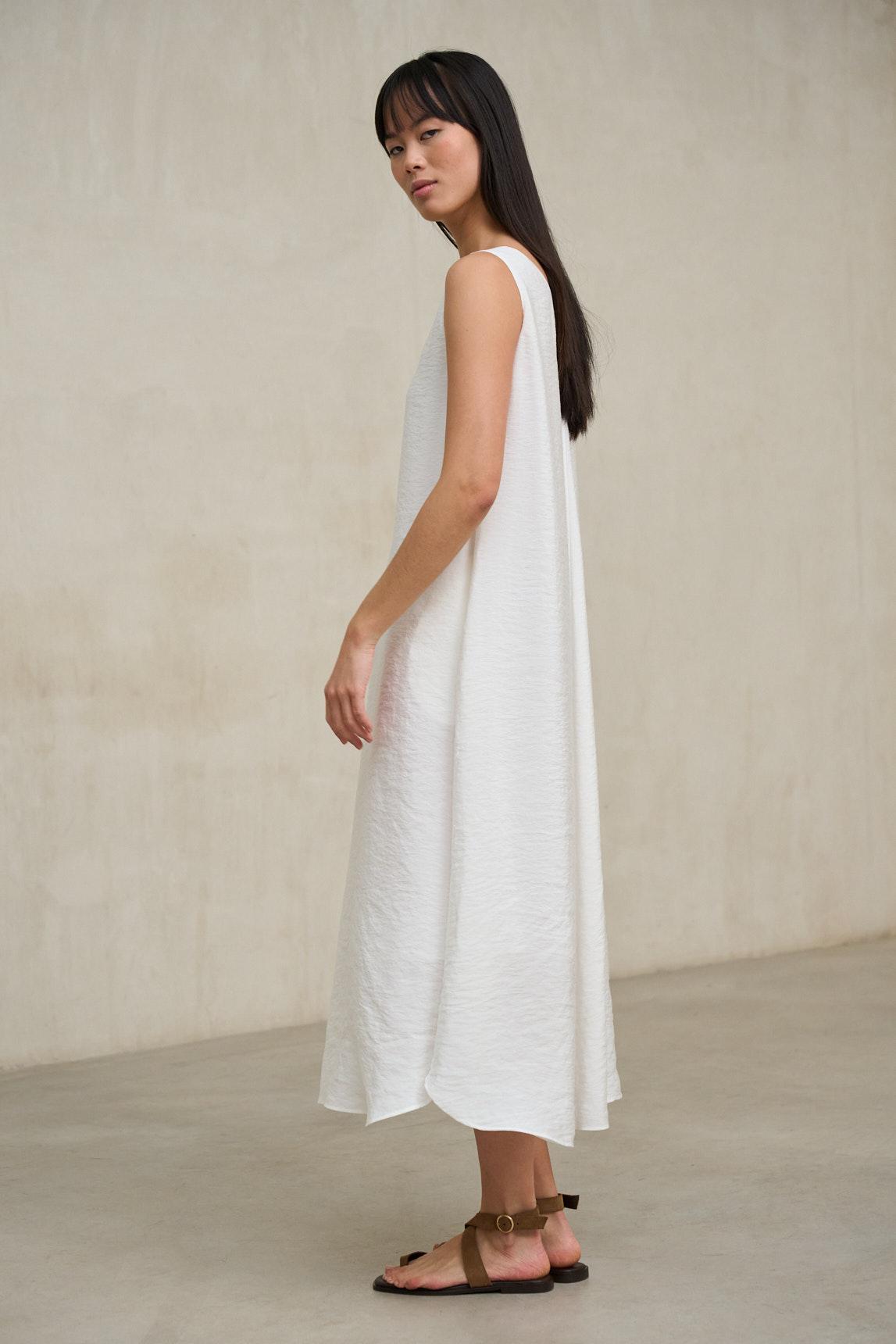 El Vestido Elenya blanco es una pieza de silueta fluida que combina ligereza y elegancia natural. Confeccionado en tejido suave de caída vaporosa, presenta escote en pico y diseño sin mangas que estiliza la parte superior y aporta frescura al conjunto.