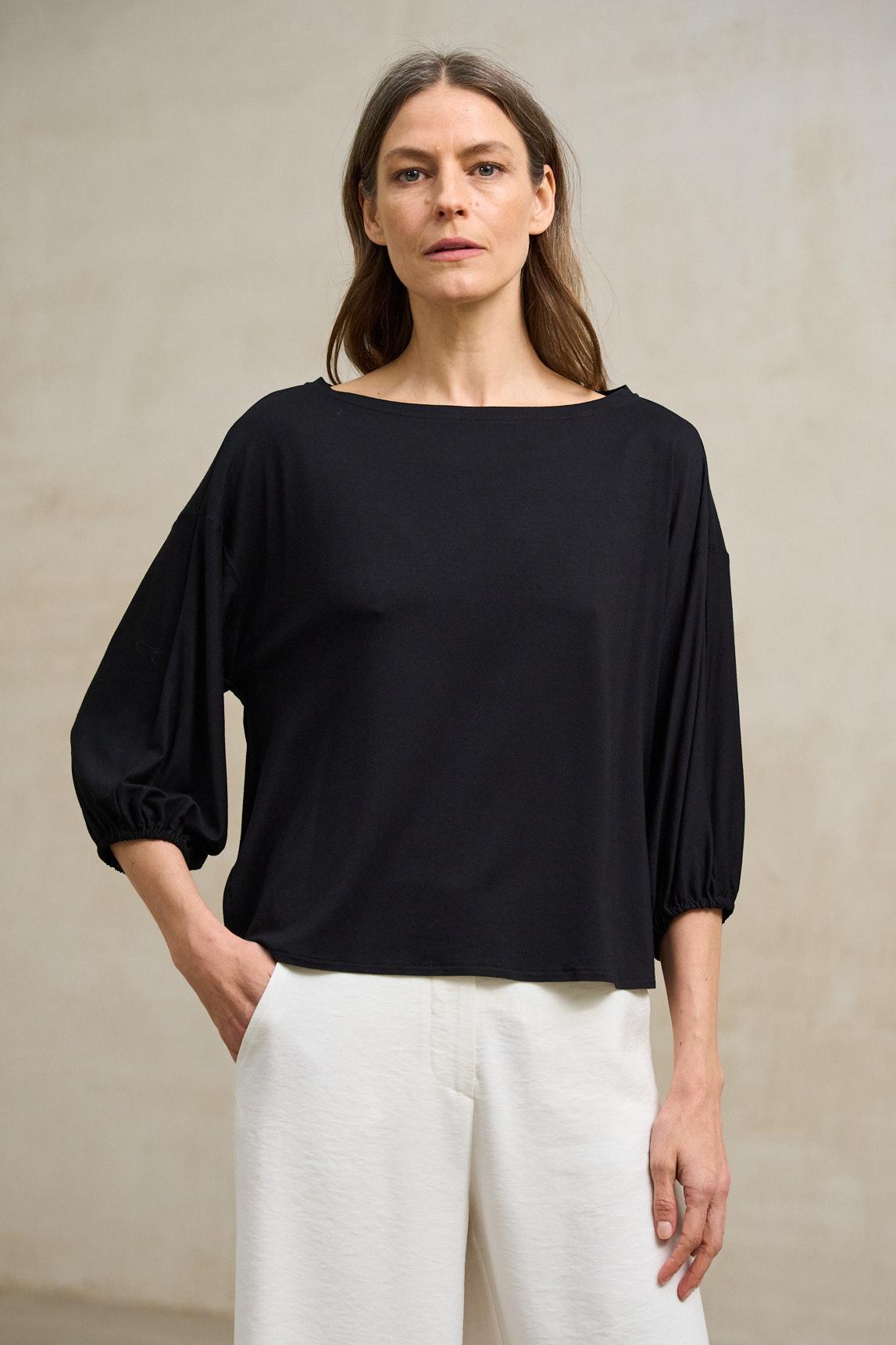 Camiseta de mujer confeccionada en tejido de punto ligero con caída fluida y tacto suave. Presenta escote barco, manga larga con frunce elástico en el puño y un corte relajado que favorece la silueta. Su diseño limpio y minimalista la convierte en una prenda cómoda y versátil para cualquier ocasión. La Camiseta Eira negra aporta un aire sofisticado a los conjuntos más sencillos. Perfecta para combinar con pantalones amplios, faldas o prendas de inspiración urbana, se adapta con facilidad tanto a looks de día como de noche gracias a su color profundo y atemporal. Nos esforzamos por mostrar los colores de la forma más fiel posible, pero pueden variar ligeramente respecto a la realidad.