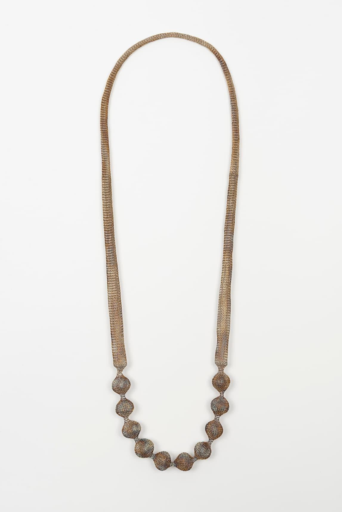 El collar Belora en latón destaca por su diseño lineal con una secuencia frontal de piezas circulares ligeramente abombadas que aportan relieve y profundidad visual. La cadena fina equilibra el volumen del centro, creando una silueta estilizada y armoniosa.
