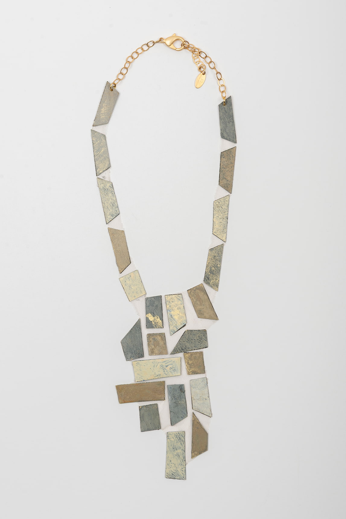 Geometrically inspired necklace with a fine chain and lobster clasp, accompanied by an adjustable extender and a small pendant. The body is composed of articulated rectangular pieces, arranged like a cascading mosaic, with a textured matte finish that alternates soft reflections between light and deeper tones, providing contrast and dimension.