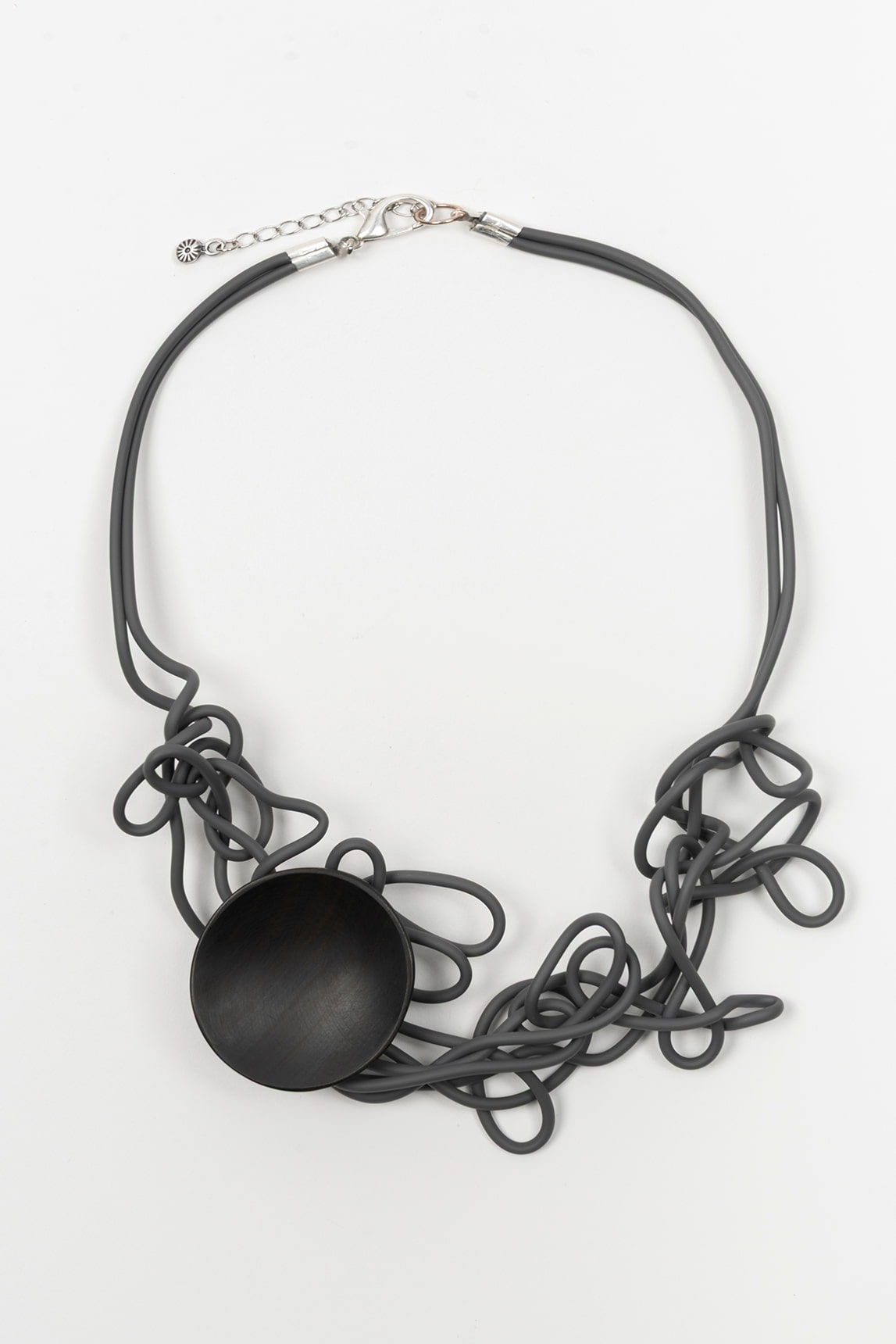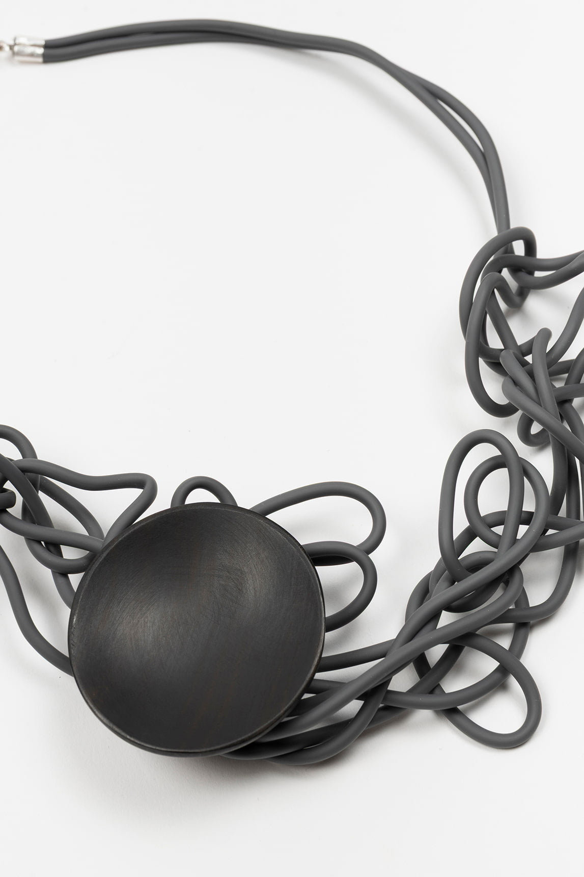 This necklace stands out for its bold and dynamic composition, made of graphite gray silicone tubes that intertwine freely and with movement. The centerpiece, a concave shape in matte black, visually anchors the design and adds depth with an elegant and understated finish.