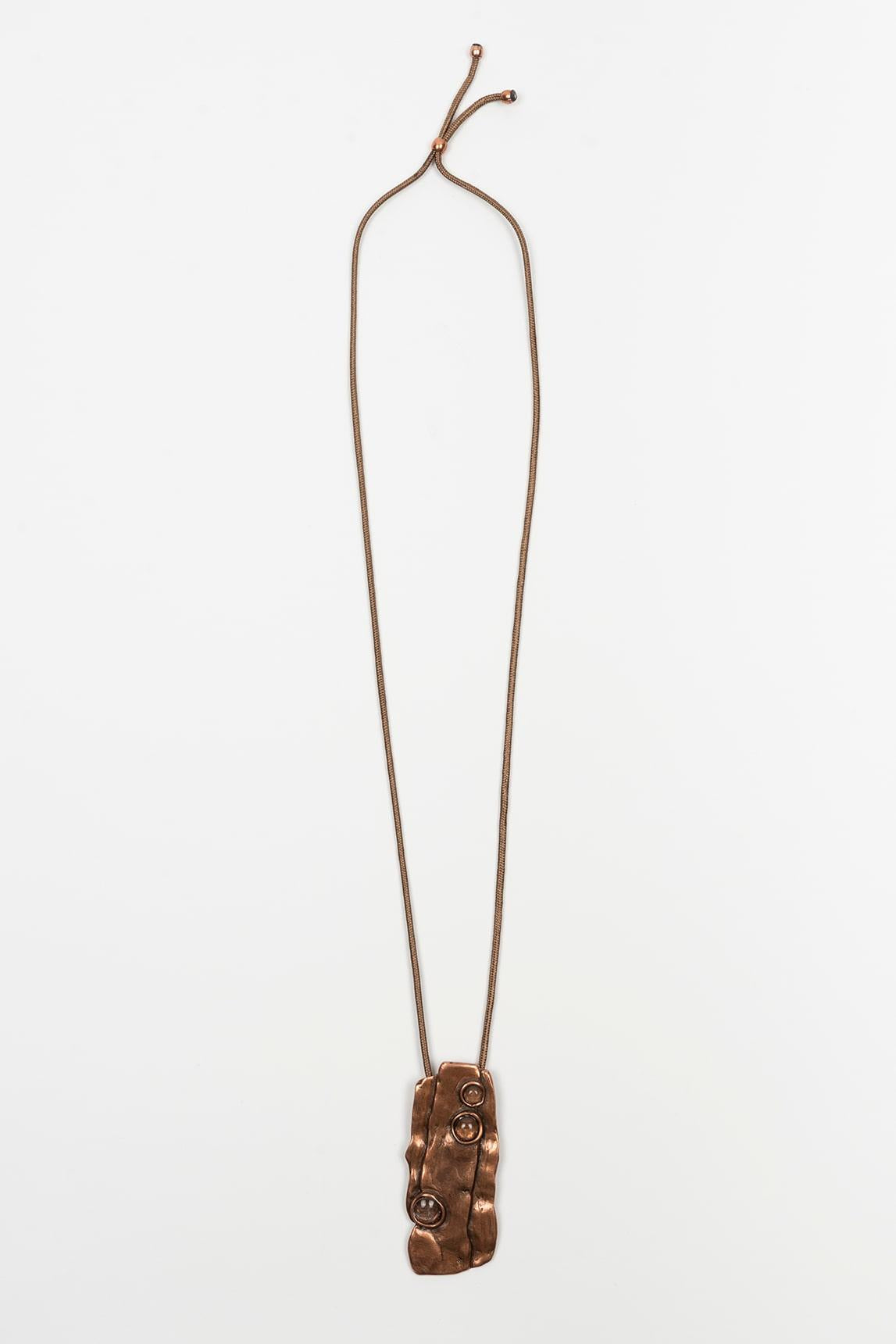 The Tavira copper necklace features the same long, clean structure with a central pendant of marked texture that adds dynamism and personality. The copper finish adds depth and warmth, especially enhancing styles in white, beige, olive green, or earth tones. Its soft sheen provides a distinctive nuance without being overwhelming, maintaining the structural elegance of the design. With visual strength and balance, the Tavira in copper is ideal for minimalist looks that seek a differentiating point. We strive to display colors as accurately as possible, but they may vary slightly from reality.