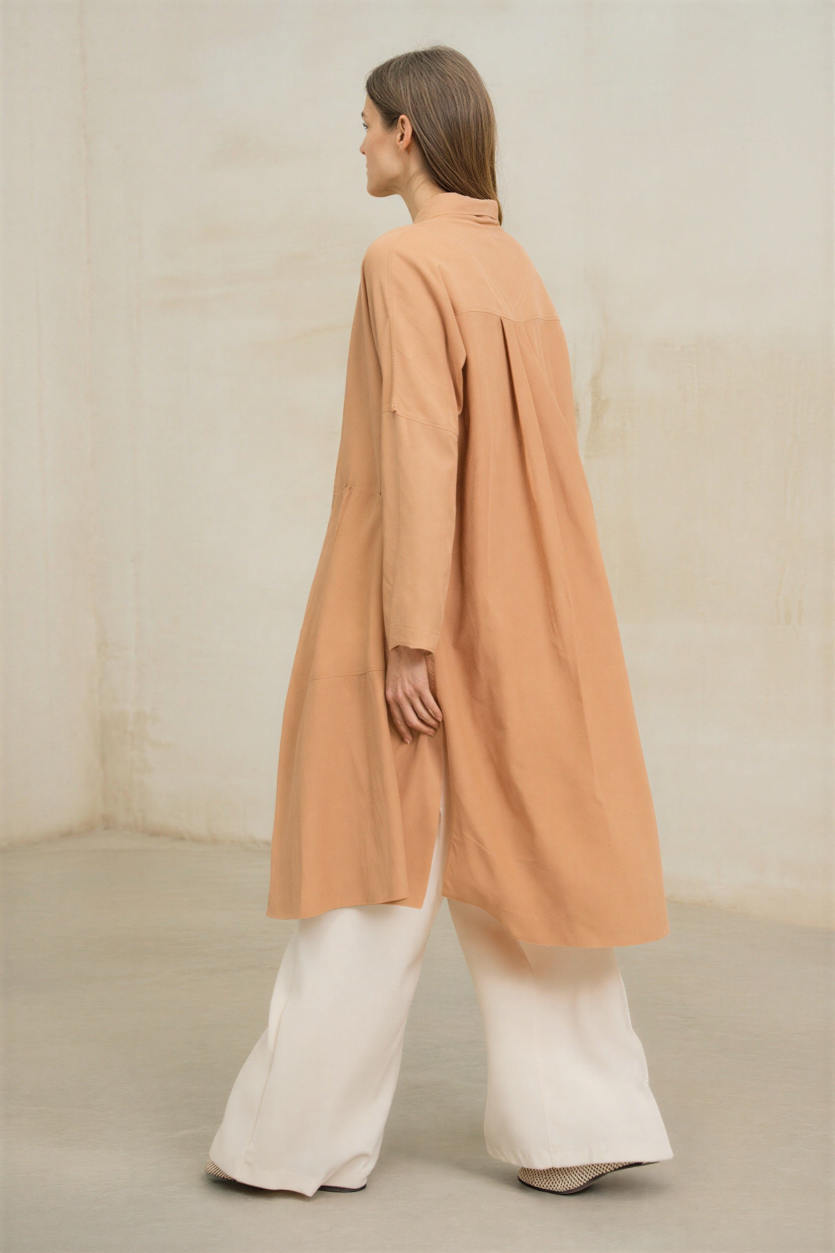 El tono melocotón, delicado y luminoso, combina con facilidad en estilismos monocromáticos o en propuestas para bodas, comuniones y celebraciones especiales. Es una prenda refinada que equilibra elegancia y comodidad.