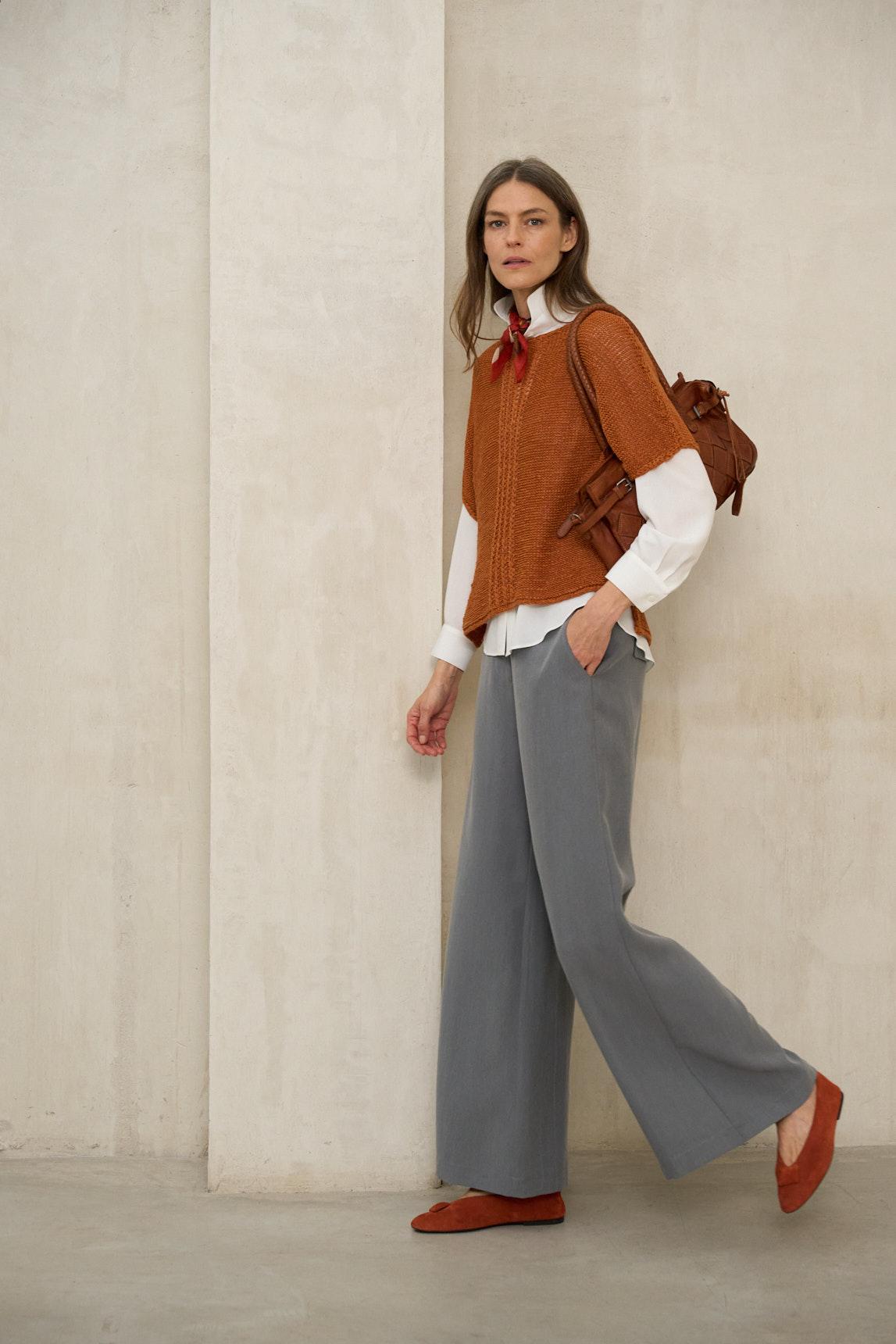 El gris oscuro aporta profundidad y sofisticación, convirtiéndolo en una base sólida para looks monocromáticos o combinaciones con blancos luminosos, tonos piedra o contrastes en negro. Su tejido fluido mantiene el movimiento y la comodidad como eje central del diseño. Ideal tanto para entornos profesionales como para estilismos urbanos más depurados, es una prenda versátil que transmite orden, presencia y naturalidad.