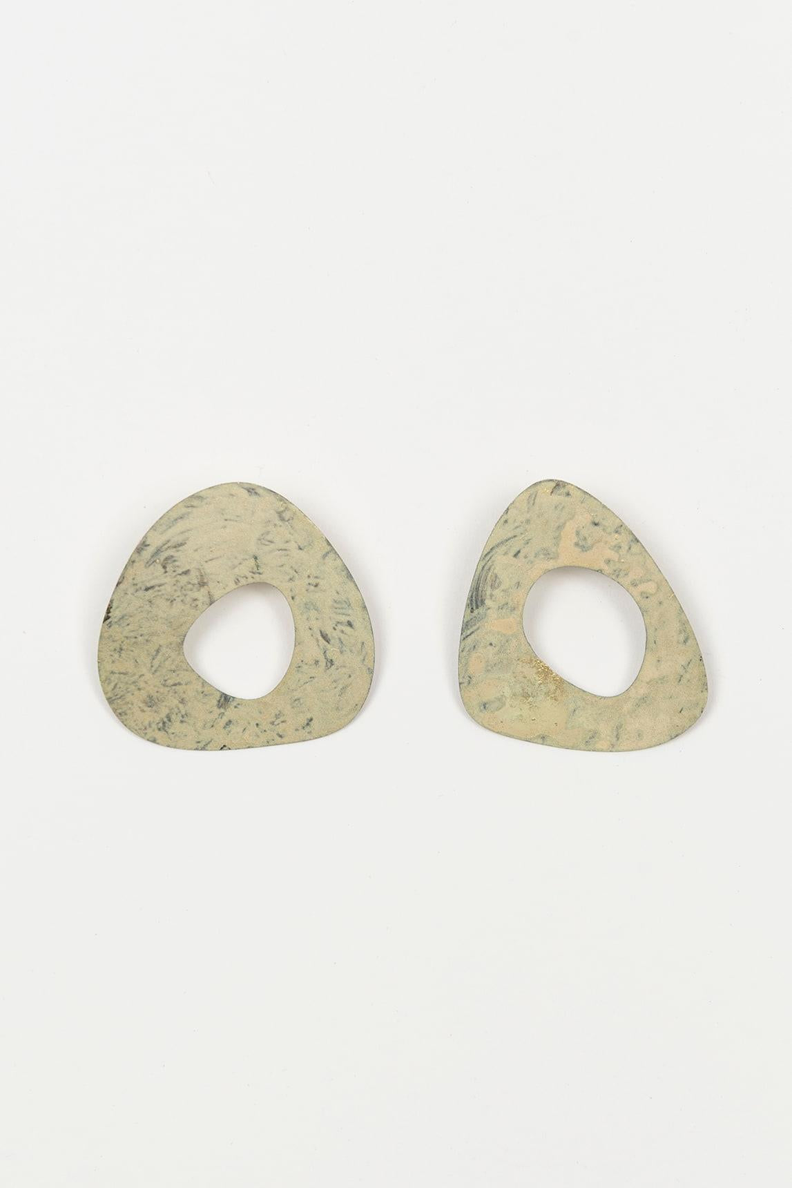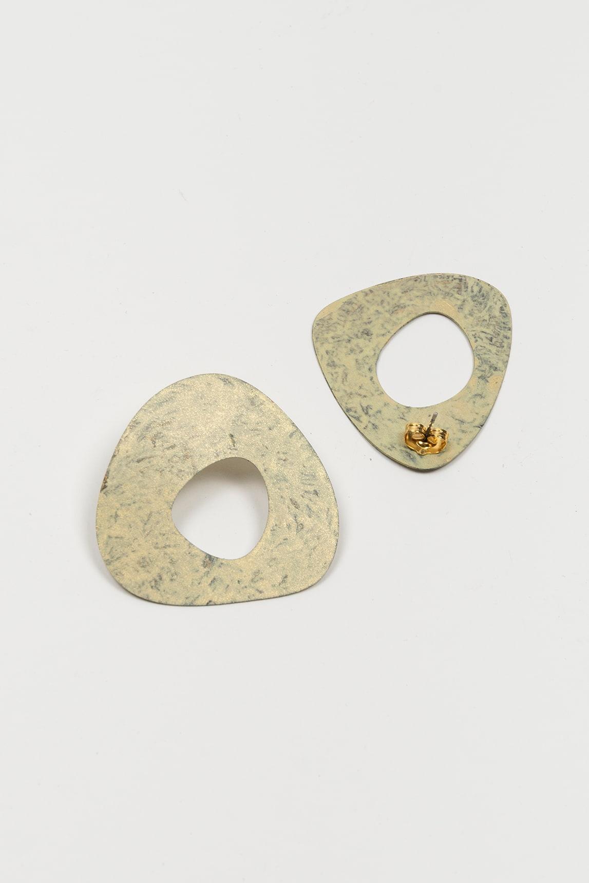 Pendientes de mujer de la marca FL Private Collection en tono verde con acabado efecto pátina y forma orgánica calada. El diseño presenta una superficie irregular con textura visual que aporta profundidad y un carácter distintivo. Están elaborados en metal de bronce tratados con pátina, generando matices únicos que refuerzan su estética artesanal y contemporánea.