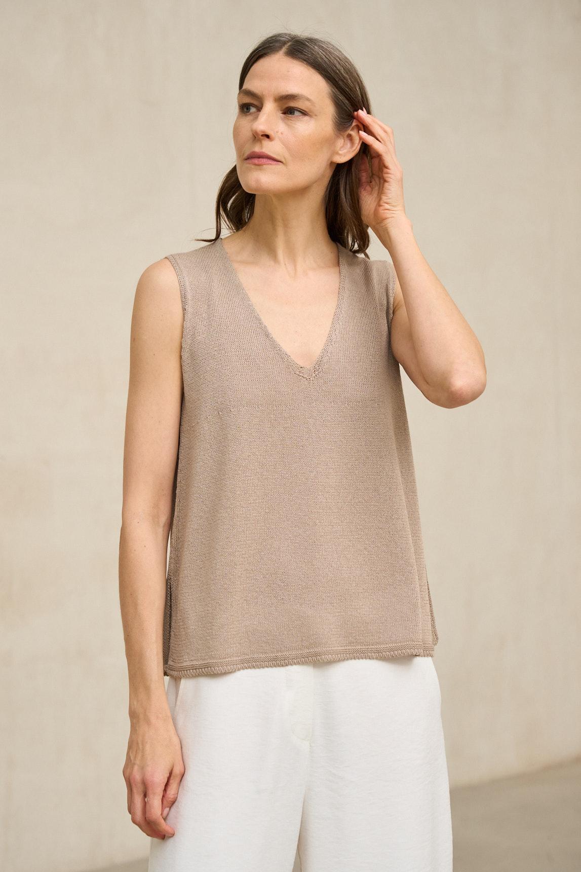El top de punto Virel arena es una prenda minimalista de líneas limpias que destaca por su silueta depurada y su caída natural. Confeccionado en tejido de punto ligero y suave, presenta escote en pico y diseño sin mangas que estiliza el torso con discreción. Su corte recto y fluido permite que la prenda se adapte al cuerpo sin ceñir, aportando comodidad y equilibrio visual.