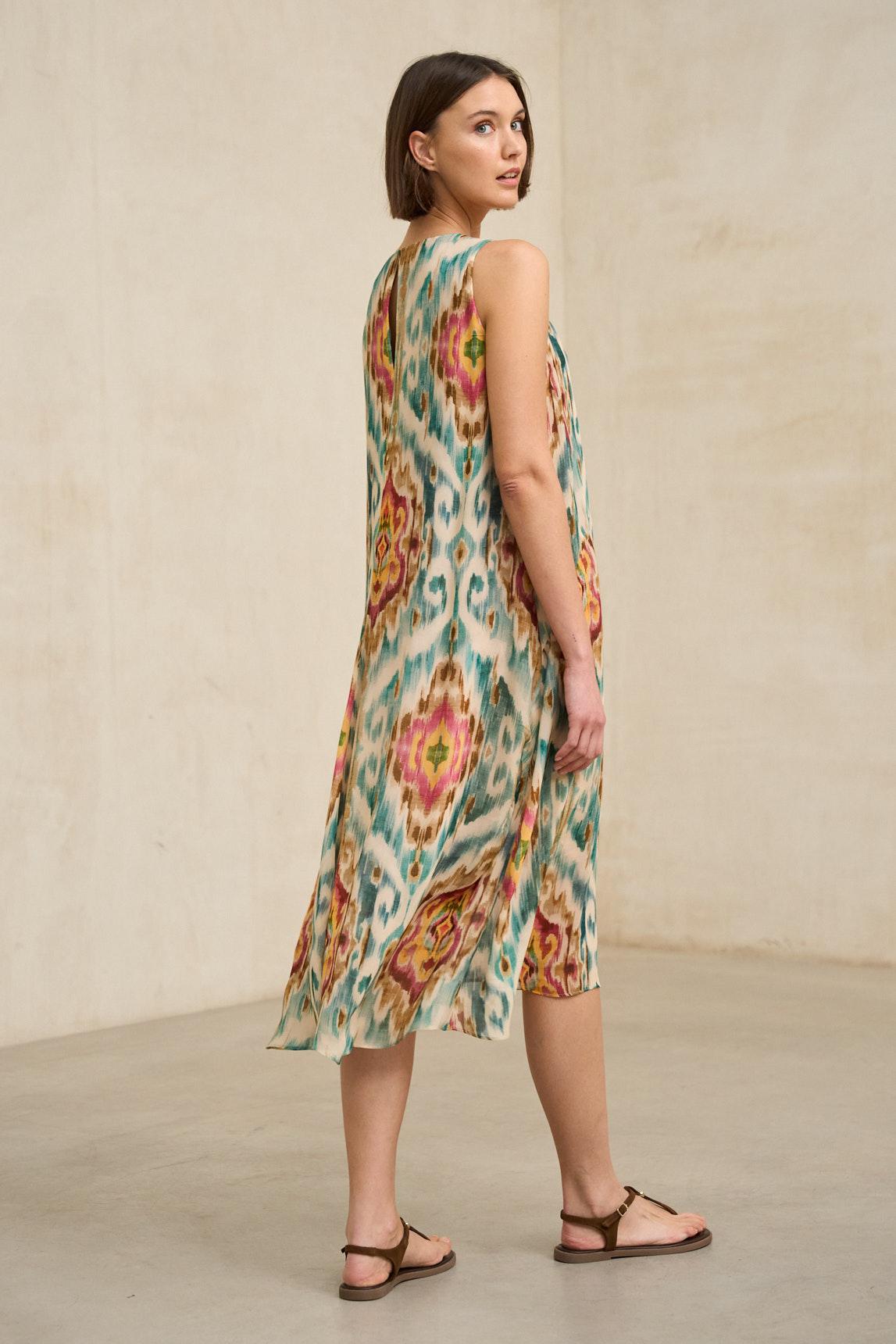 The printed Naïra dress maintains the fluid silhouette and minimalist design that define the style. With a V-neck and sleeveless cut, it features a loose, flowing structure that drapes naturally, creating movement and lightness as you walk. Its relaxed fit drapes gently away from the body, providing comfort and a streamlined effect without being restrictive. The midi length and soft drape of the fabric enhance its versatile and contemporary character, ideal for everyday wear or for more sophisticated looks with statement accessories. The new print combines shades of green, terracotta, and warm tones in an organically inspired pattern that adds dynamism and personality to the design. It works especially well with sandals in natural leather, raffia, or neutral tones that balance the strength of the pattern. A comfortable, fresh and characterful piece, designed to create light and stylish looks with their own identity during spring and summer. We strive to display colors as accurately as possible, but they may vary slightly from reality.